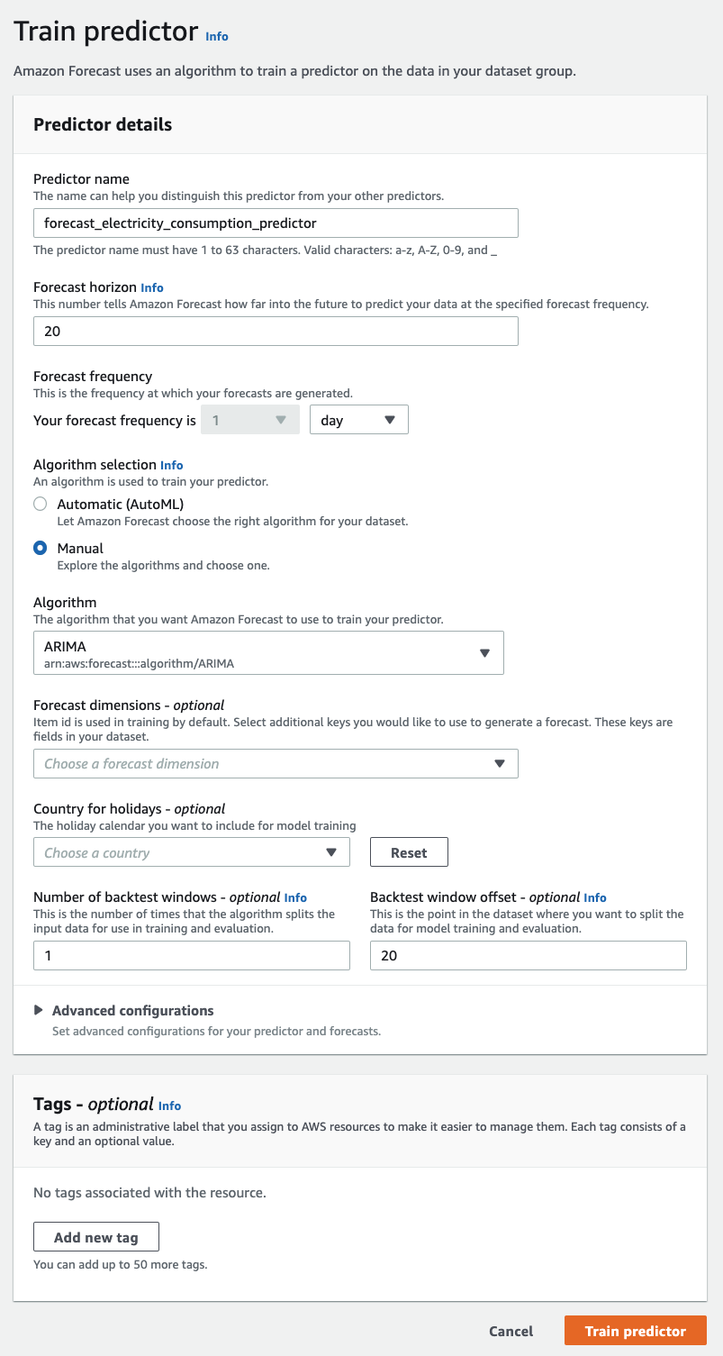 - choisissez l’algorithme de manière manuelle et choisissez l’algorithme ARIMA. Ici l’algorithme consiste à des étapes de traitement des données qui sont nécessaires pour former un prédicteur.Choisissez l’option Automatique si vous souhaitez laisser Amazon Forecast choisir le meilleur algorithme pour votre ensemble de données. Choisissez l’option Manuel si vous préférez choisir votre propre algorithme. Amazon Forecast fournit les algorithmes intégrés suivants pour divers scénarios de prévision: