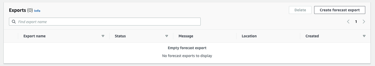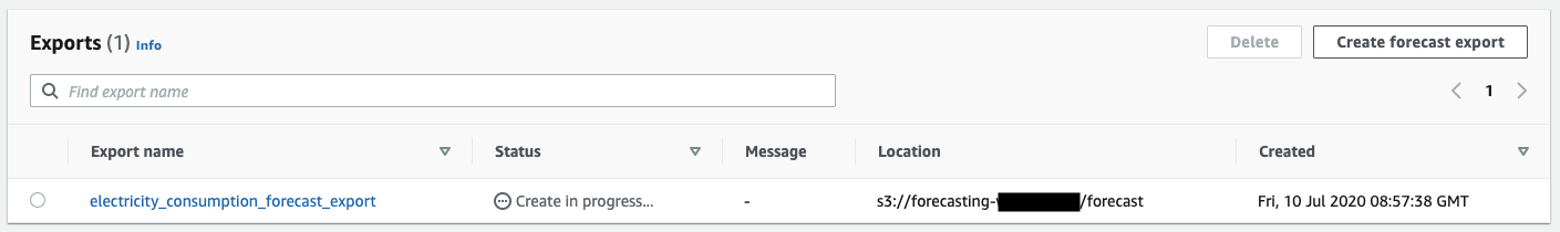 12 – Une fois que la construction de prédiction est finalisée (cela peut prendre quelques minutes), nous allons créer un export afin de permettre à Amazon Forecast d’enregistrer les données de prédictions dans notre répertoire/forecast de notre compartiment/bucket Amazon S3.