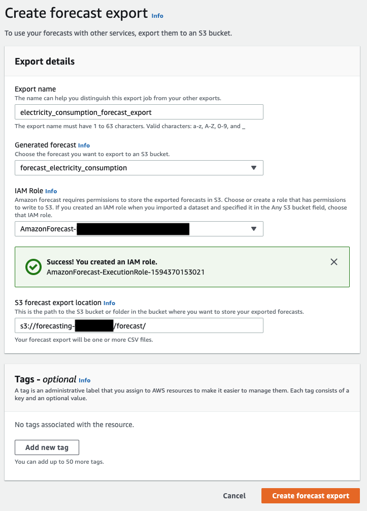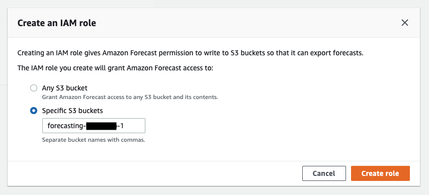 - créer un rôle IAM pour donner accès au compartiment Amazon S3 à Amazon Forecast pour pouvoir réaliser l’export. pour cela, sélectionnez “Specific S3 buckets” et renseignez le nom de votre compartiment S3. Puis cliquez sur “Create role”.