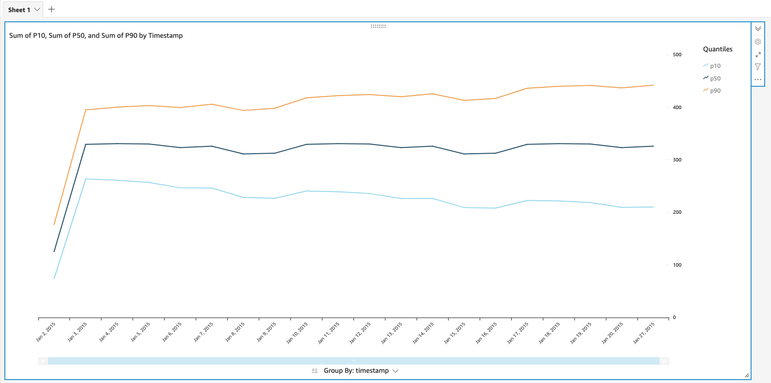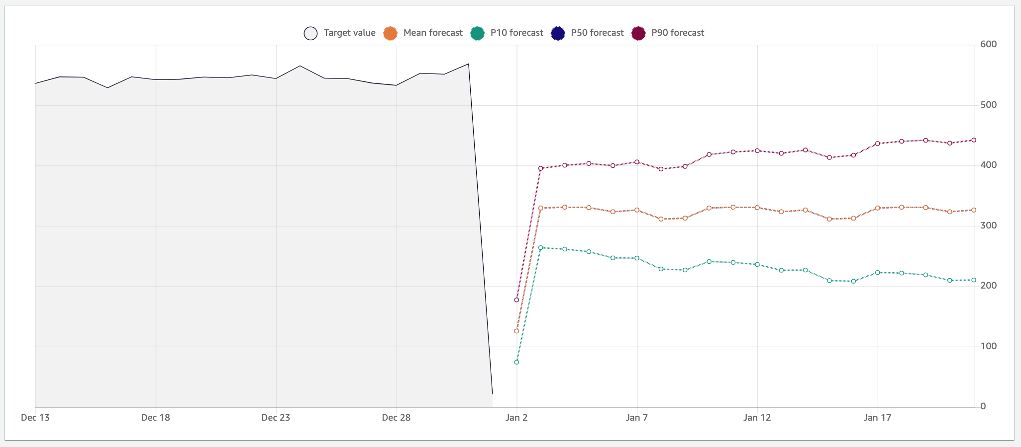 Les quantiles (intervalles de prédiction) expriment l’incertitude du résultat. Amazon Forecast s’appuie sur une approche probabiliste avec trois quantiles, 10%, 50%, 90%, et le service nous permet de calculer l’erreur associée. Les quantiles nous permettent d’avoir un intervalle de possible valeur.