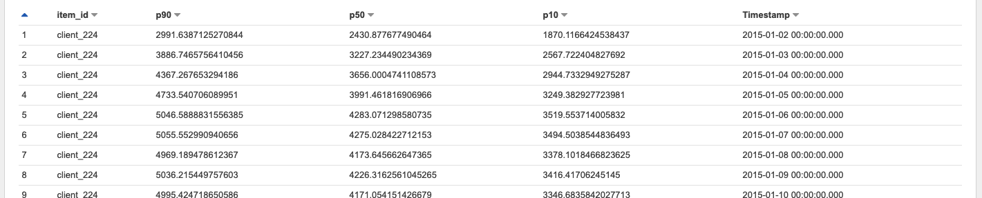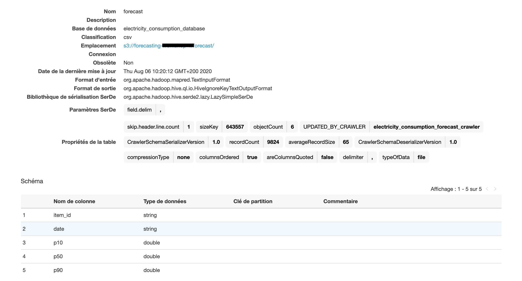Si vous cliquez sur le nom de votre table vous devez être en mesure de voir les paramètres suivant correspondants aux paramèrtes des prédictions générées par Amazon Forecast.