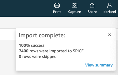 15 – Une fois sur le dashboard, attendez quelques minutes que Quicksight charge les données dans le SPICE. Une fois terminez vous aurez ce message :