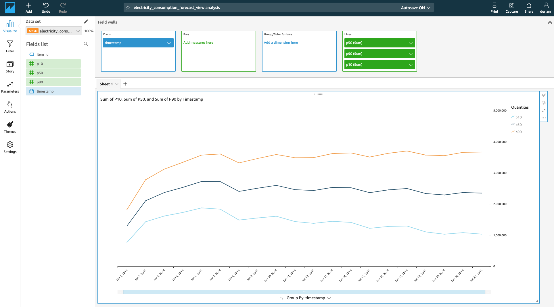 Ici, le graphique nous montre les prédictions exportées depuis Amazon Forecast mais basées sur toutes les consommations de tous les clients. Nous allons maintenant filtrer cela et afficher les prédictions d’un seul client.