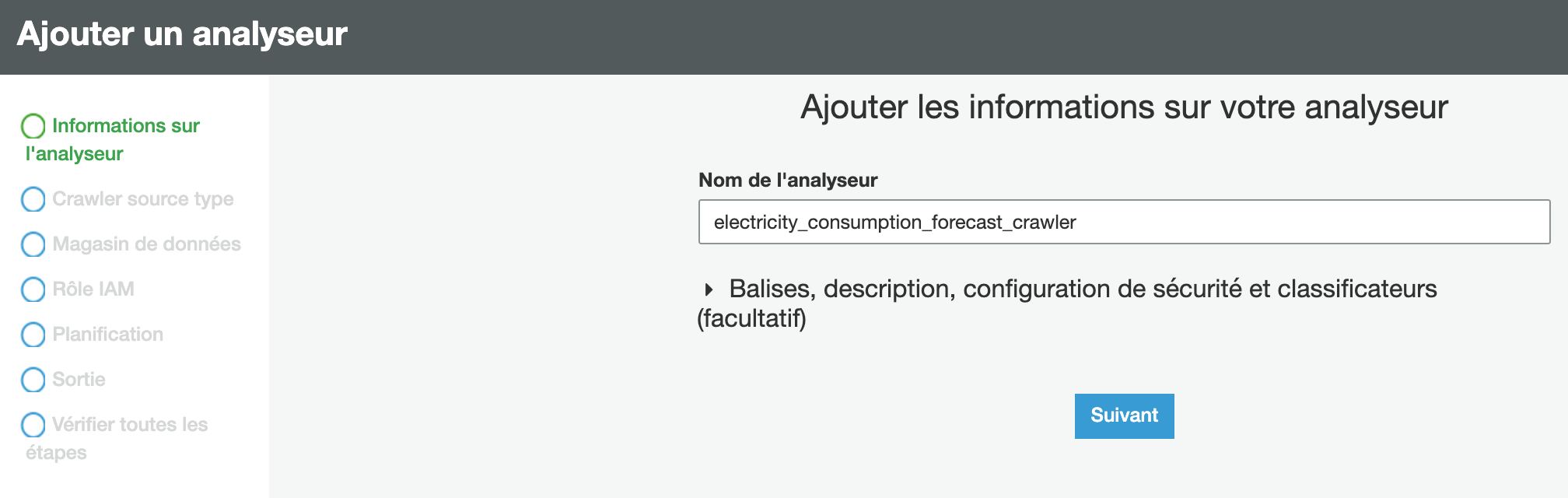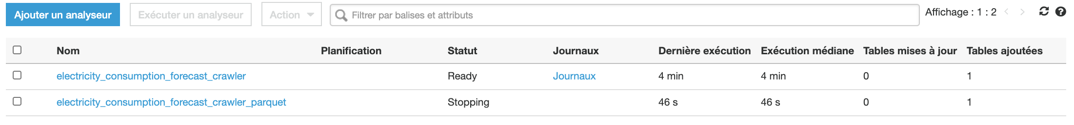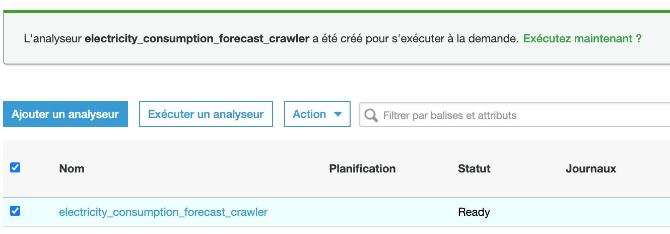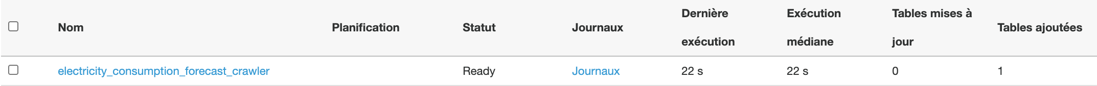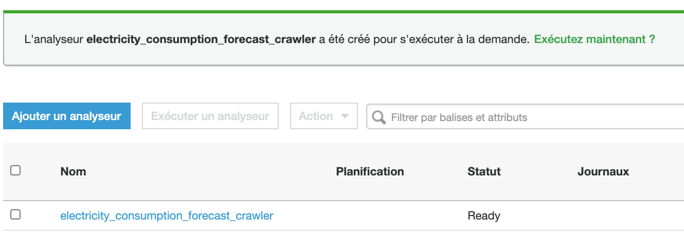 Vous pouvez donc répéter les étapes précédentes pour créer un nouvel analyseur appelé “electricity_consumption_forecast_crawler_parquet” dont le rôle va être de créer une nouvelle table dans le catalogue de données.