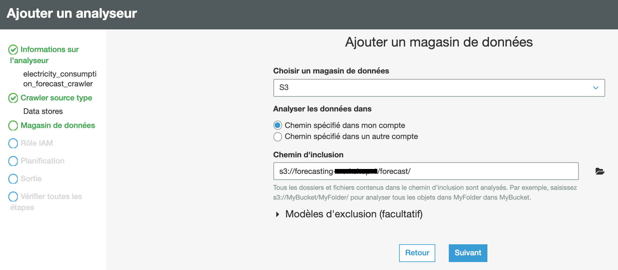 - le type de notre data store ou magasin de données en français ainsi que le chemin vers nos données à cataloguer situées dans le répertoire /forecast de notre compartiment S3.
