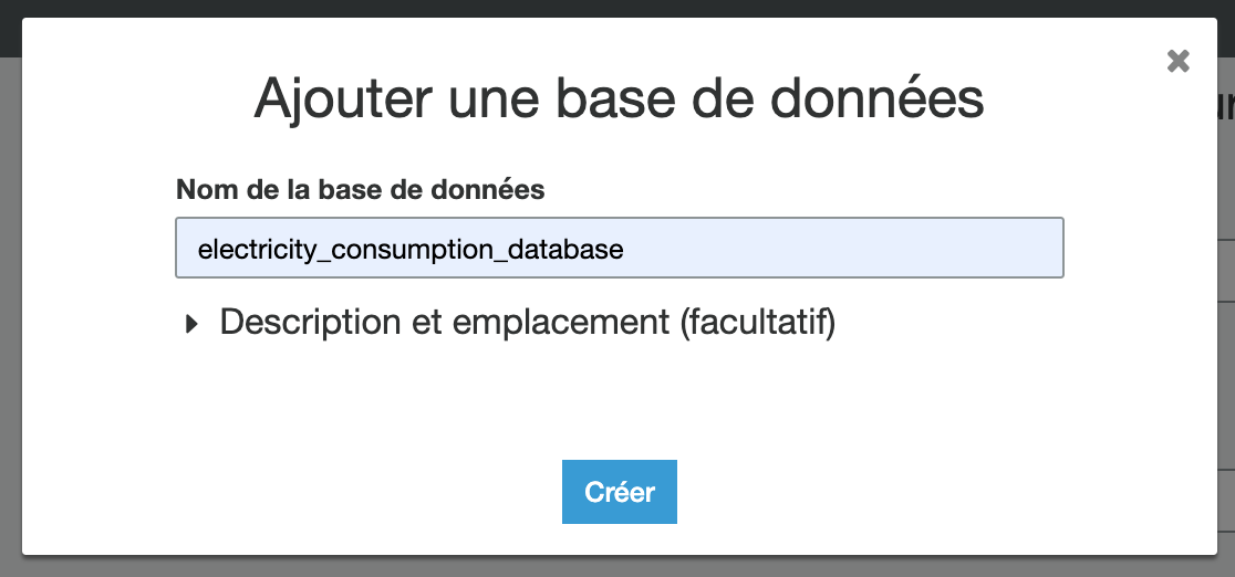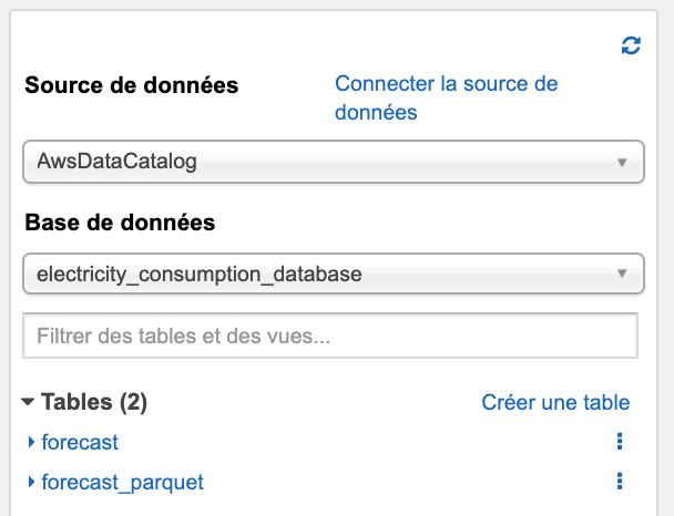 - créez une base de données qui va stocker les métadonnées (schéma) de vos données de prédictions. La base de données va contenir des informations comme une table forecast contenant des paramètres que nous allons découvrir plus loin.