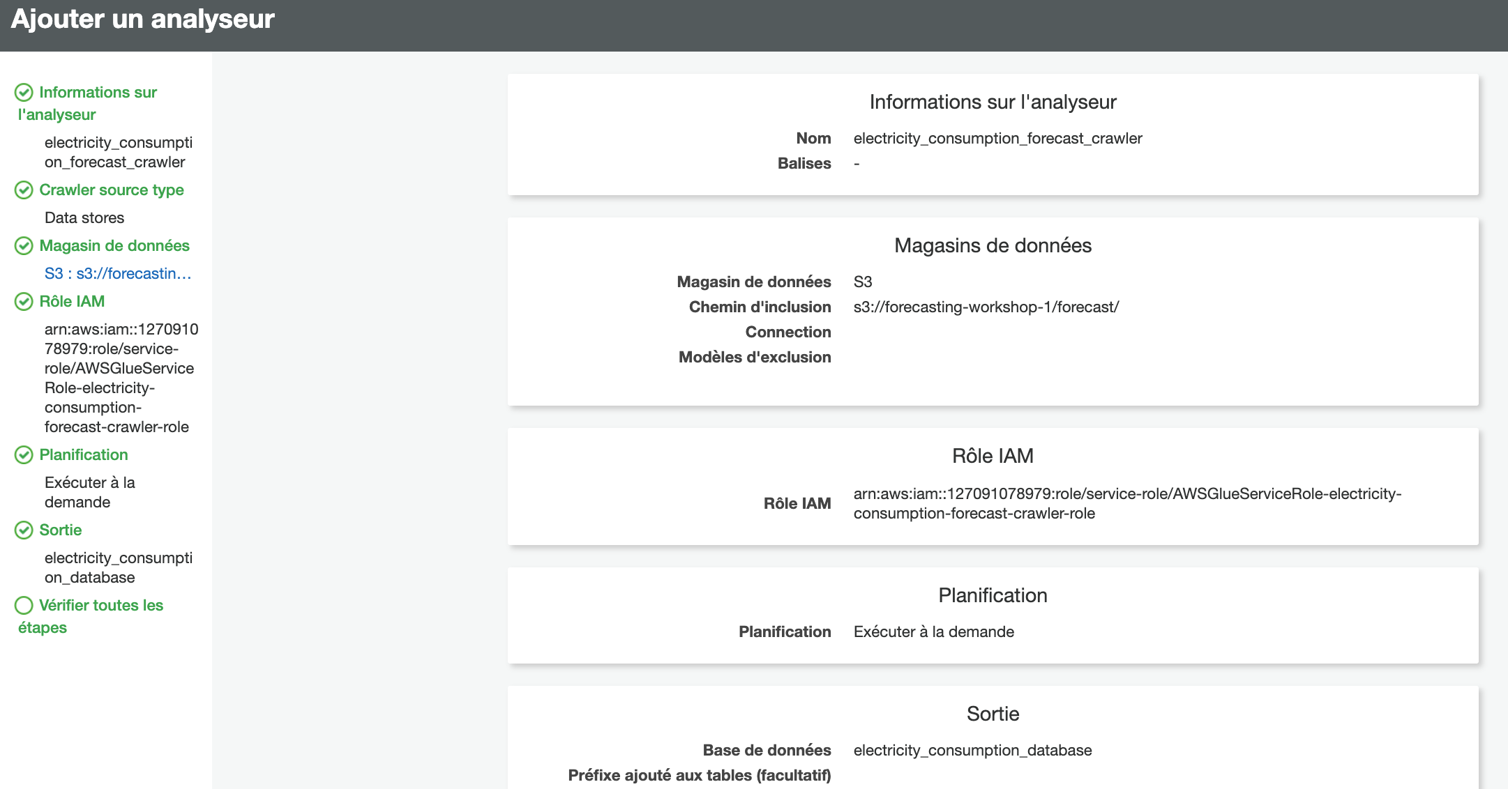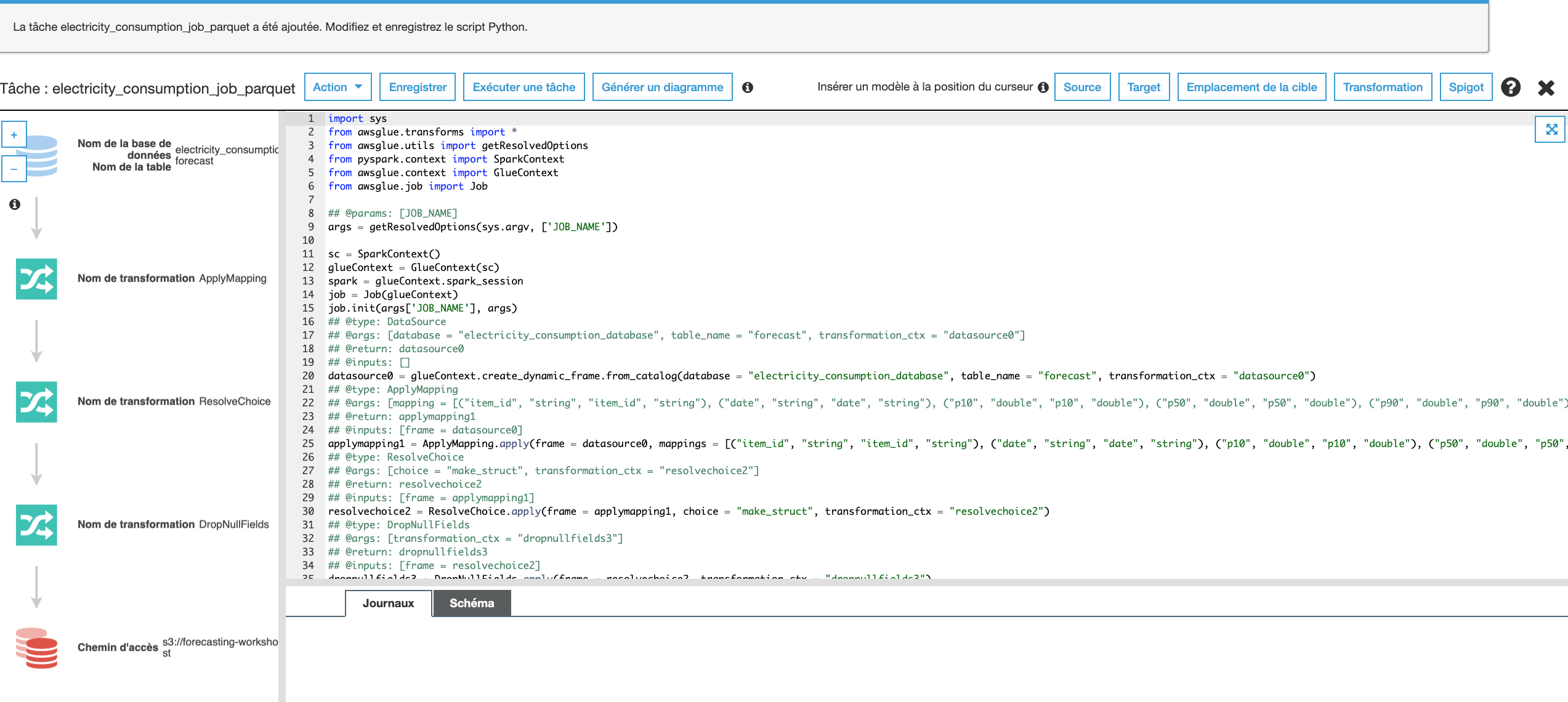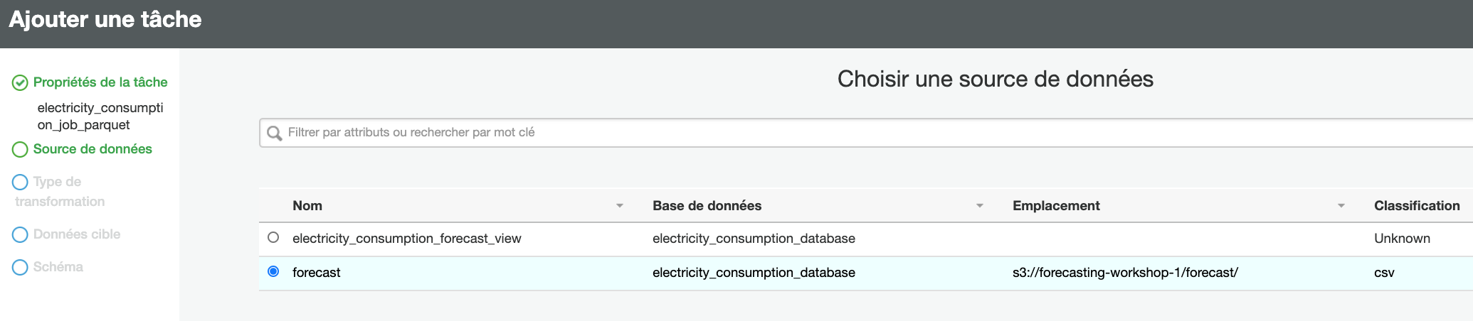 Ce nouvel analyseur utilisera le chemin menant à vos données au format Parquet créé par votre tâche précédente : s3://forecasting-<YOURNAME>/forecast_parquet/.