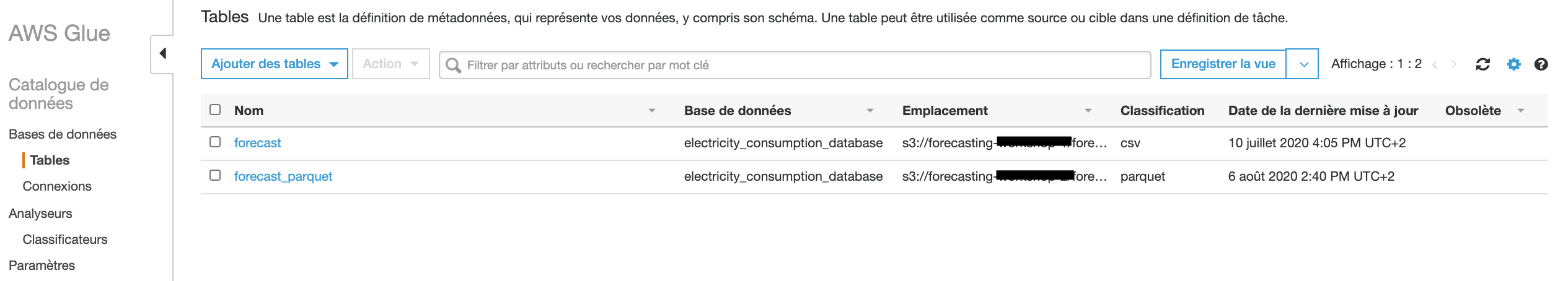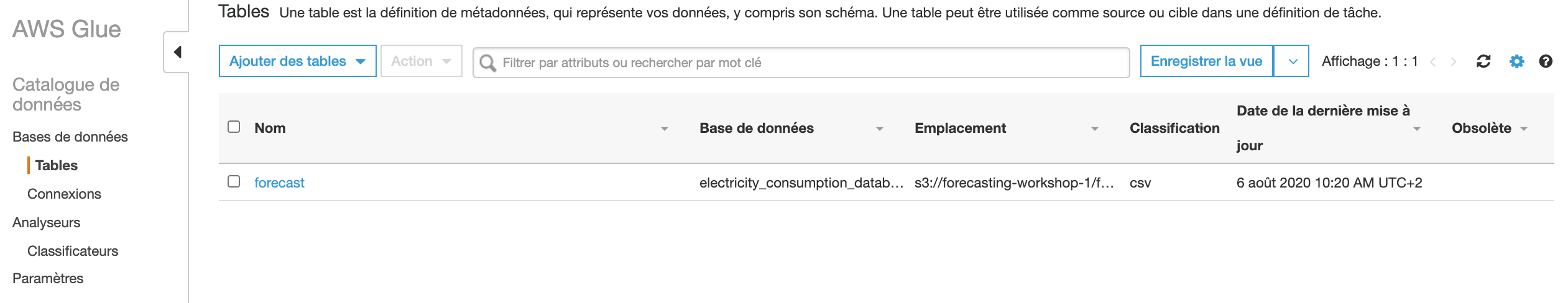14 – Une fois que votre analyseur a terminé son exécution, vous devriez obtenir une table supplémentaire dans votre catalogue de données. Une table nommée “forecast_parquet” comme le nom de votre répertoire contenant les données en Parquet.