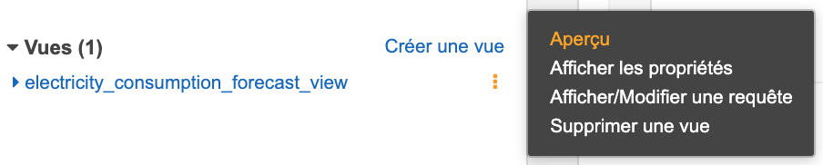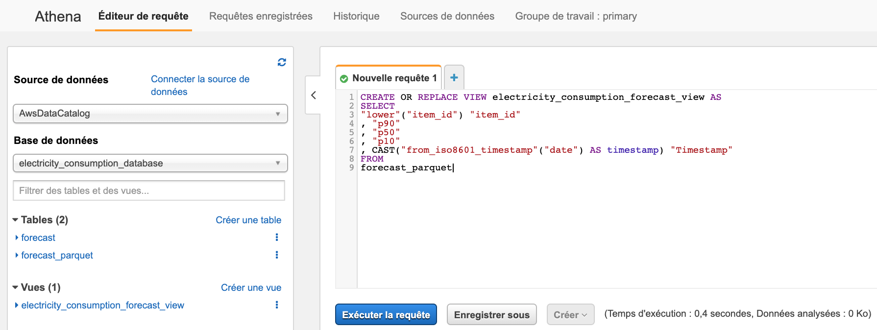 Nous allons maintenant créer une vue qui va nous permettre de rassembler les données de la table “forecast” qui nous intéresse mais aussi convertir le paramètre “date” qui est au format String vers le format Timestamp pour pouvoir l’utiliser dans Amazon Quicksight.