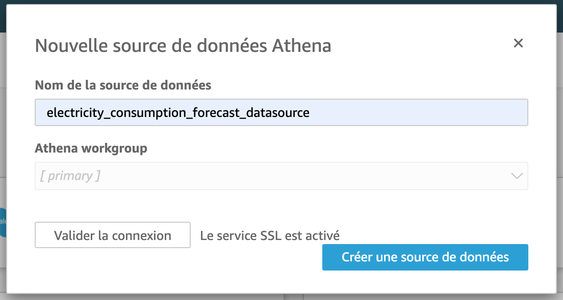 12 – Créez une nouvelle source de données côté Quicksight et donnez lui un nom. Cliquez ensuite sur “Créer une source de données”.