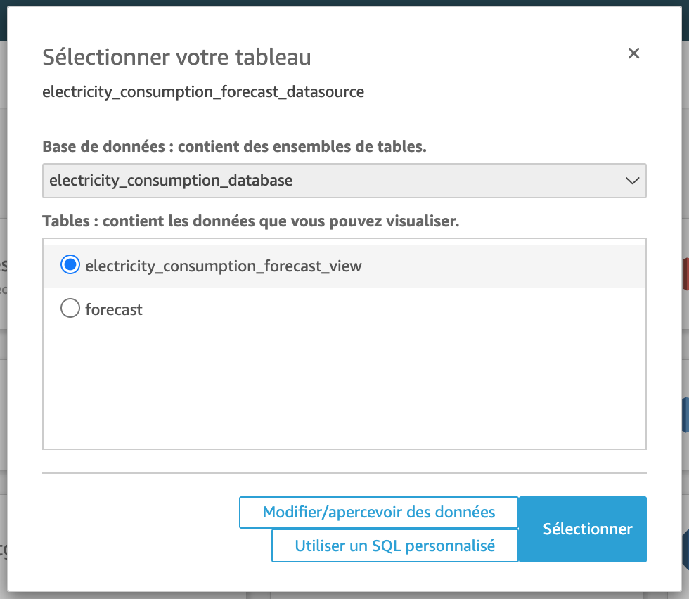 13 – Sélectionnez ensuite votre base de données contenant votre catalogue de données puis la vue crée précédemment via Athena.