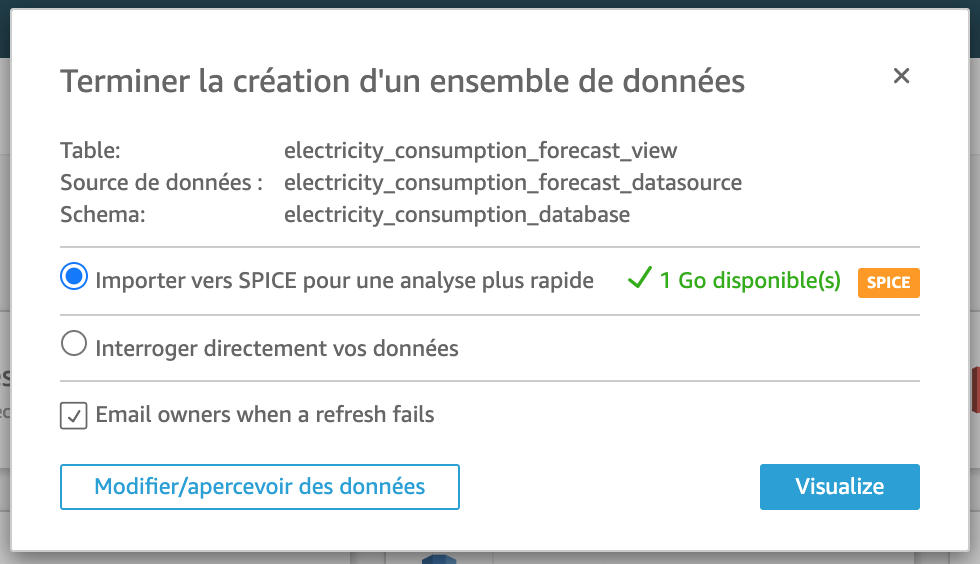 14 – Importez les données depuis Amazon Athena dans votre SPICE pour un chargement plus rapide de vos données.