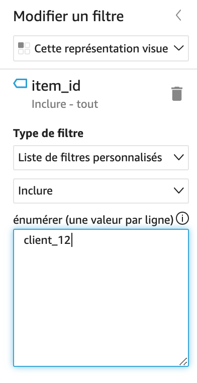 Choisissez “Liste de filtres personnalisés” comme Filter type puis renseignez le nom du client à filter pour nos prédictions. Ici client_12.