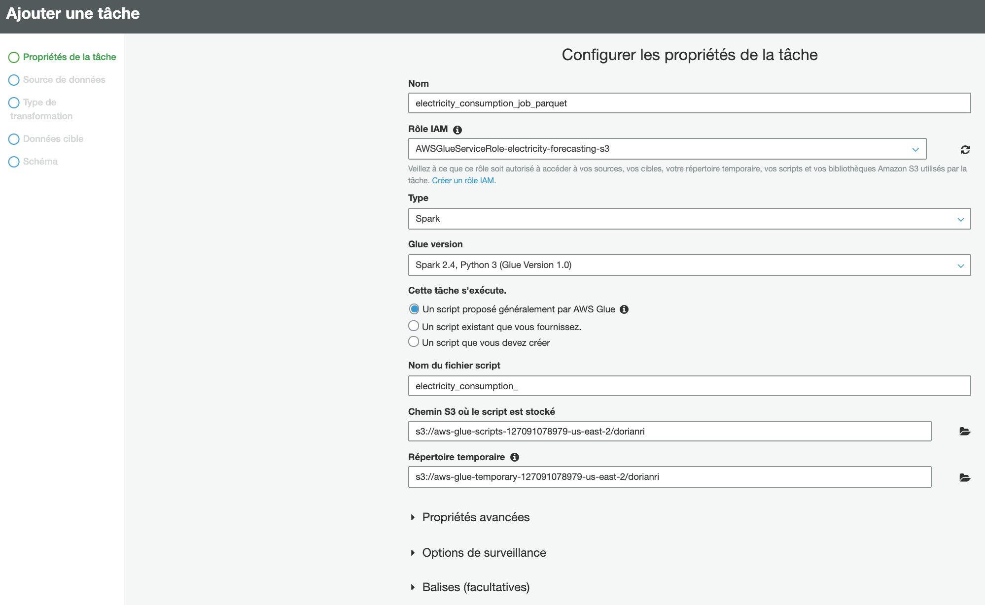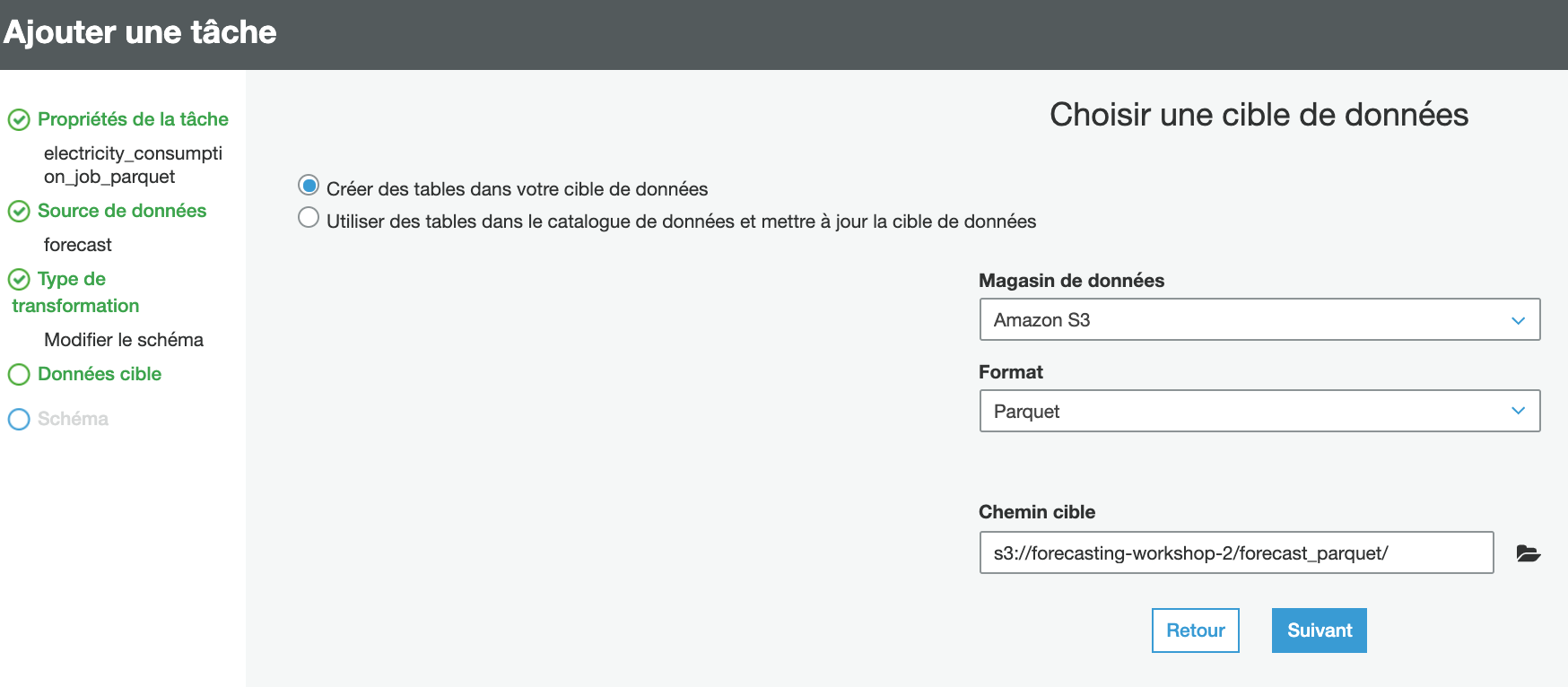 10 – Définissez un répertoire cible pour vos données qui seront converties au format Parquet par votre tâche AWS Glue. Ici le répertoire qui contiendra nos données au format Parquet s’appellera forecast_parquet.