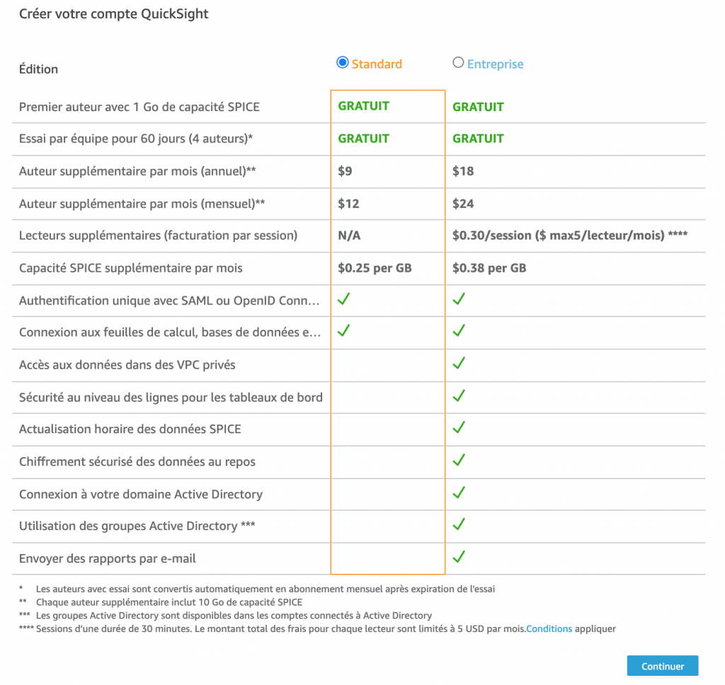 8 – Choisissez ici la version de QuickSight. Ici nous allons utiliser la version “Standard”