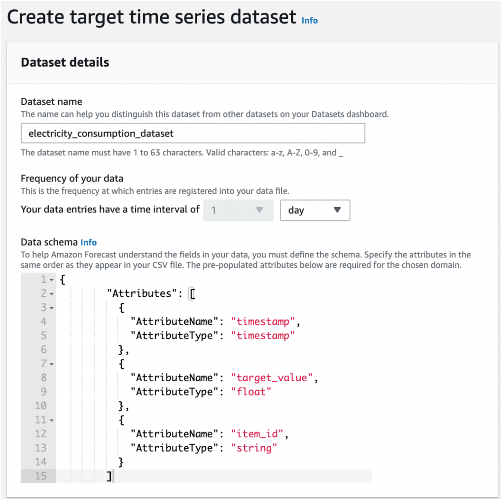 Si vous prévoyez d’avoir un grand nombre de dataset groups, vous pouvez utiliser une convention de nommage cohérente afin de pouvoir facilement retrouver vos dataset groups sur le tableau de bord.Après avoir nommé votre dataset group, vous fournissez d’autres informations dont Amazon Forecast a besoin, telles que la fréquence de collecte des données dans votre compartiment Amazon S3 et le format de l’horodatage des données. Ces informations aident Amazon Forecast à comprendre comment vos données sont collectées et structurées.