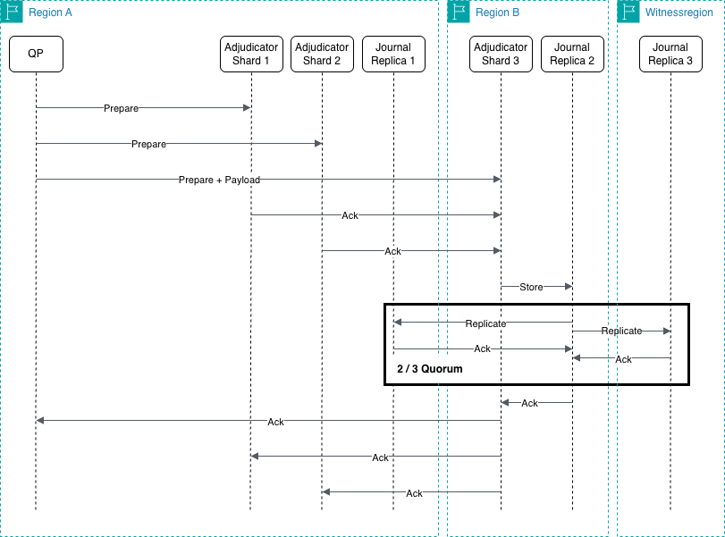 This process is designed to be efficient – data is sent once, and responses flow back through the system in a way that handles both the commitment decision and data replication across Regions in a single pass. This coordinated approach ensures that distributed transactions remain consistent across the entire system while minimizing unnecessary back-and-forth communication.