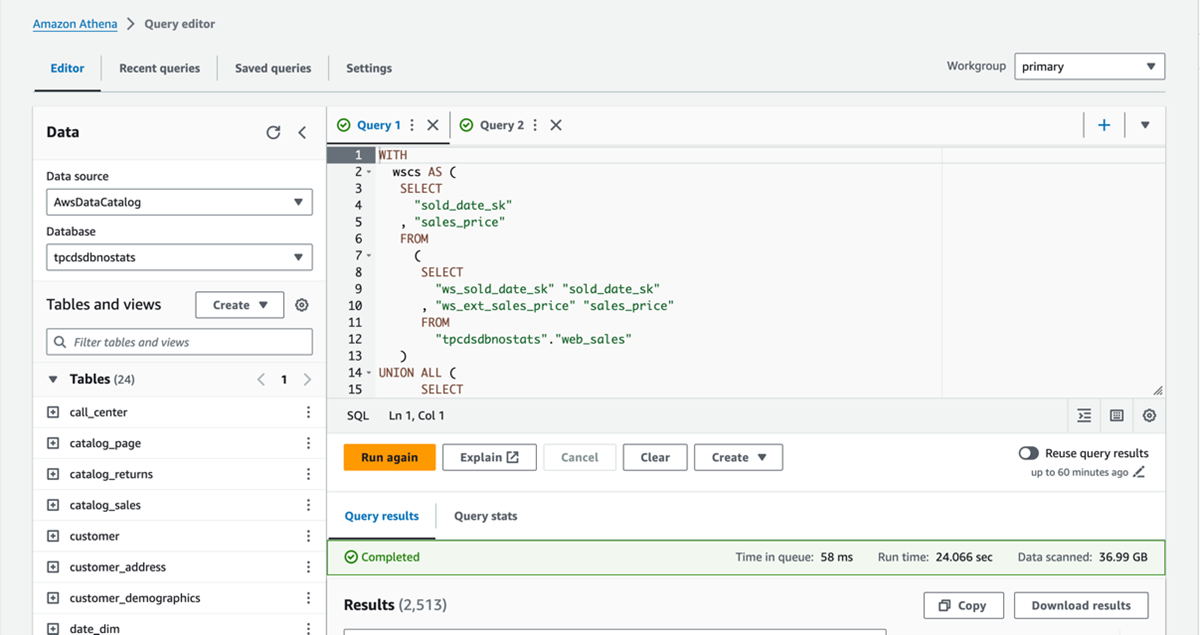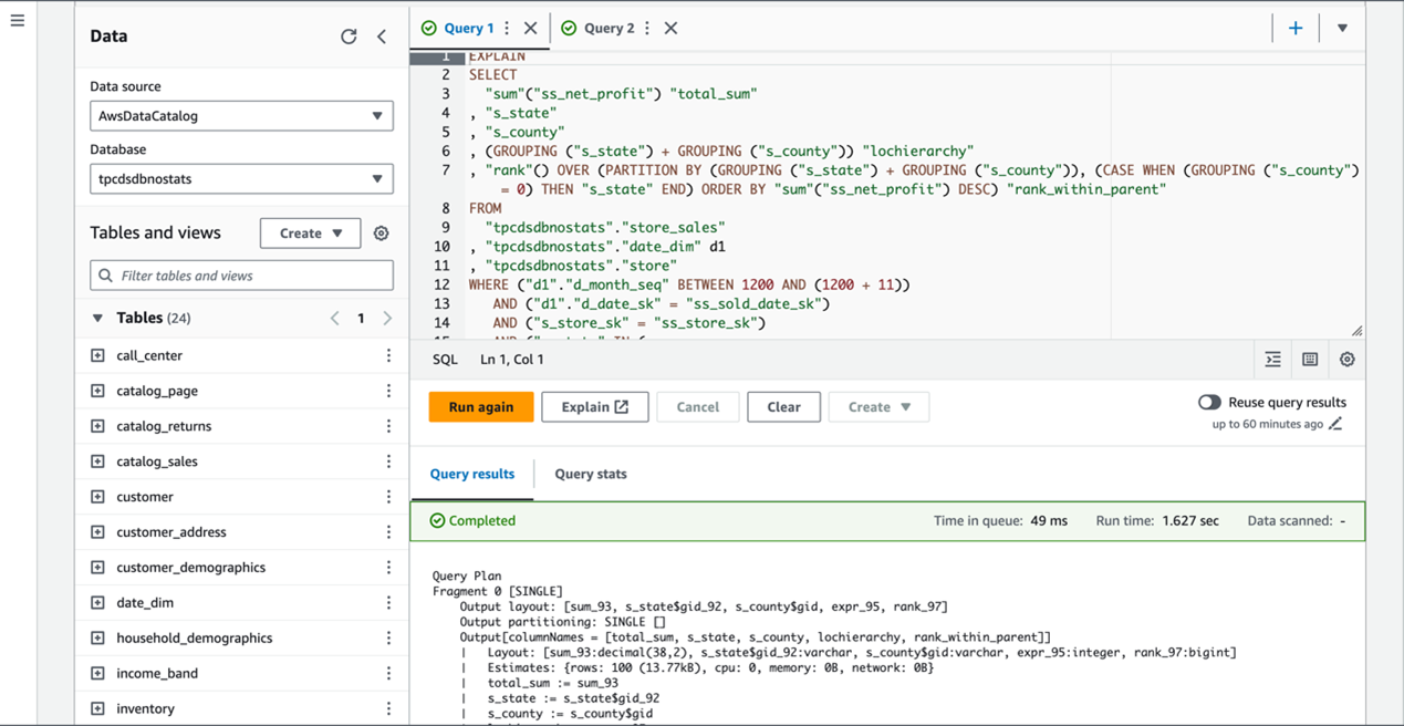 Amazon Athena からも TPC-DS テーブル (現時点では統計情報なし) をクエリしてみましょう。Amazon Athena でクエリを実行するには、以下の手順を完了します: