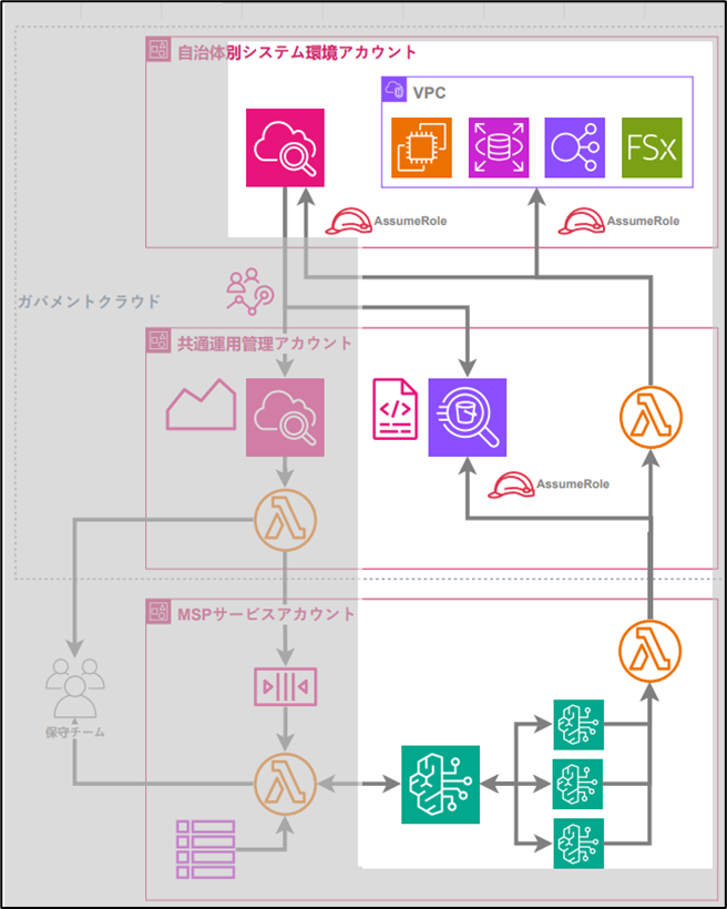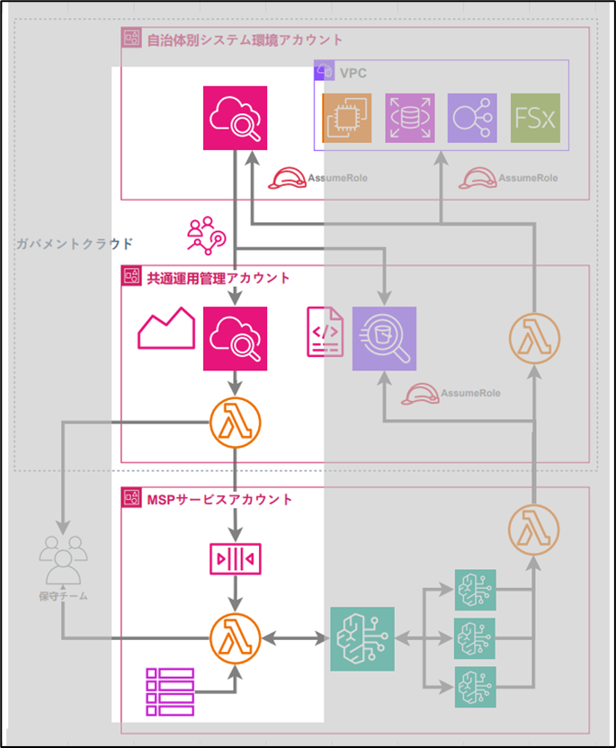 私たちは以前からガバメントクラウド上の環境を集約して管理する「共通運用アカウント」を構築・運用していました。FA3 は、この共通運用アカウントに集約されるデータを活用することで、効率的に障害分析を行える仕組みとしています。