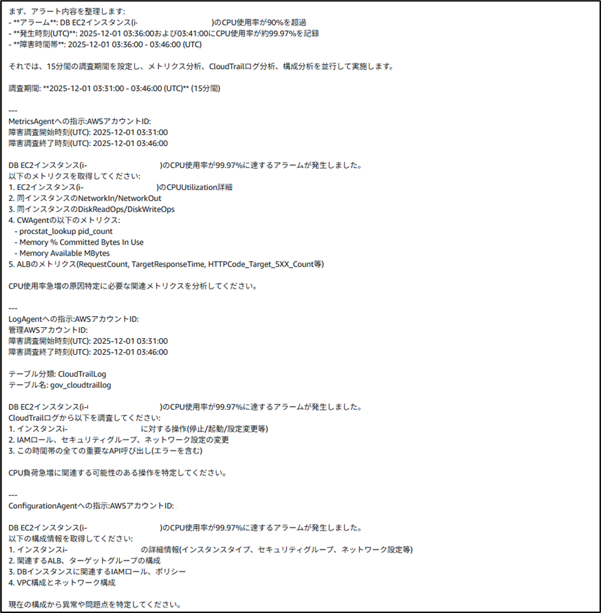 呼び出された Lambda が、DynamoDB から該当アカウントの情報を取得し、受け取ったアラーム情報と組み合わせて、Amazon Bedrock Agents へのプロンプトを生成します。 - 障害調査