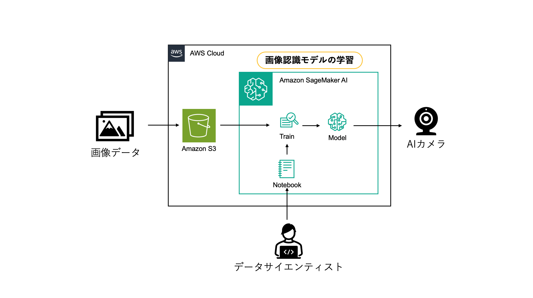 図3に示すように、データパイプラインは、画像データを Amazon S3 に保存し、SageMaker AI のトレーニングジョブに投入する流れで構築しました。トレーニングジョブの出力モデルは、カスタムスクリプトで AI カメラ専用の形式に変換し、デバイスにインストールします。