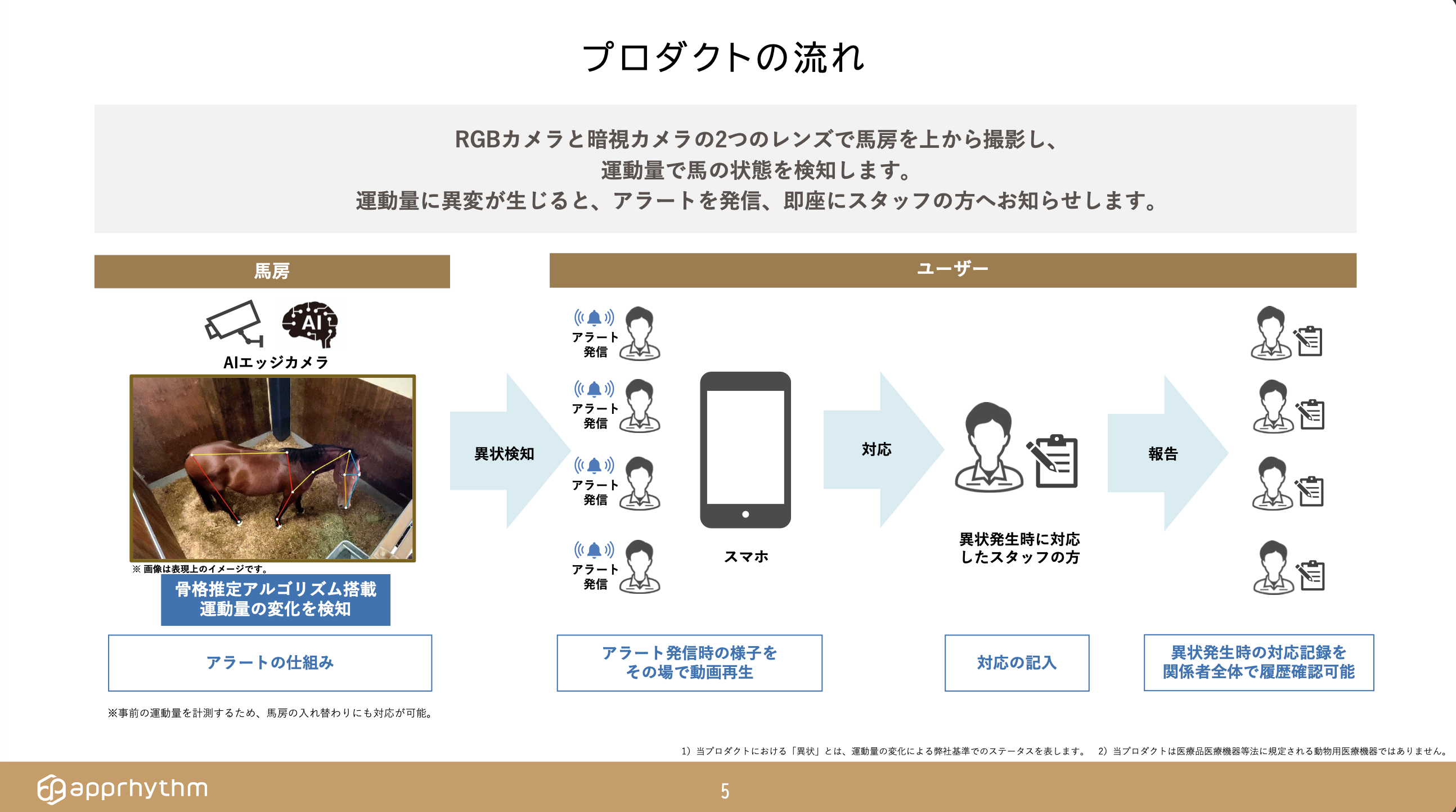 図1に示すように、aiba は AI エッジカメラで馬房を監視し、骨格推定アルゴリズムにより馬の運動量を解析します。運動量に異変が生じると、即座にスタッフのスマートフォンにアラートが発信され、異常発生時の動画再生や対応記録の履歴管理まで一貫して行えます。