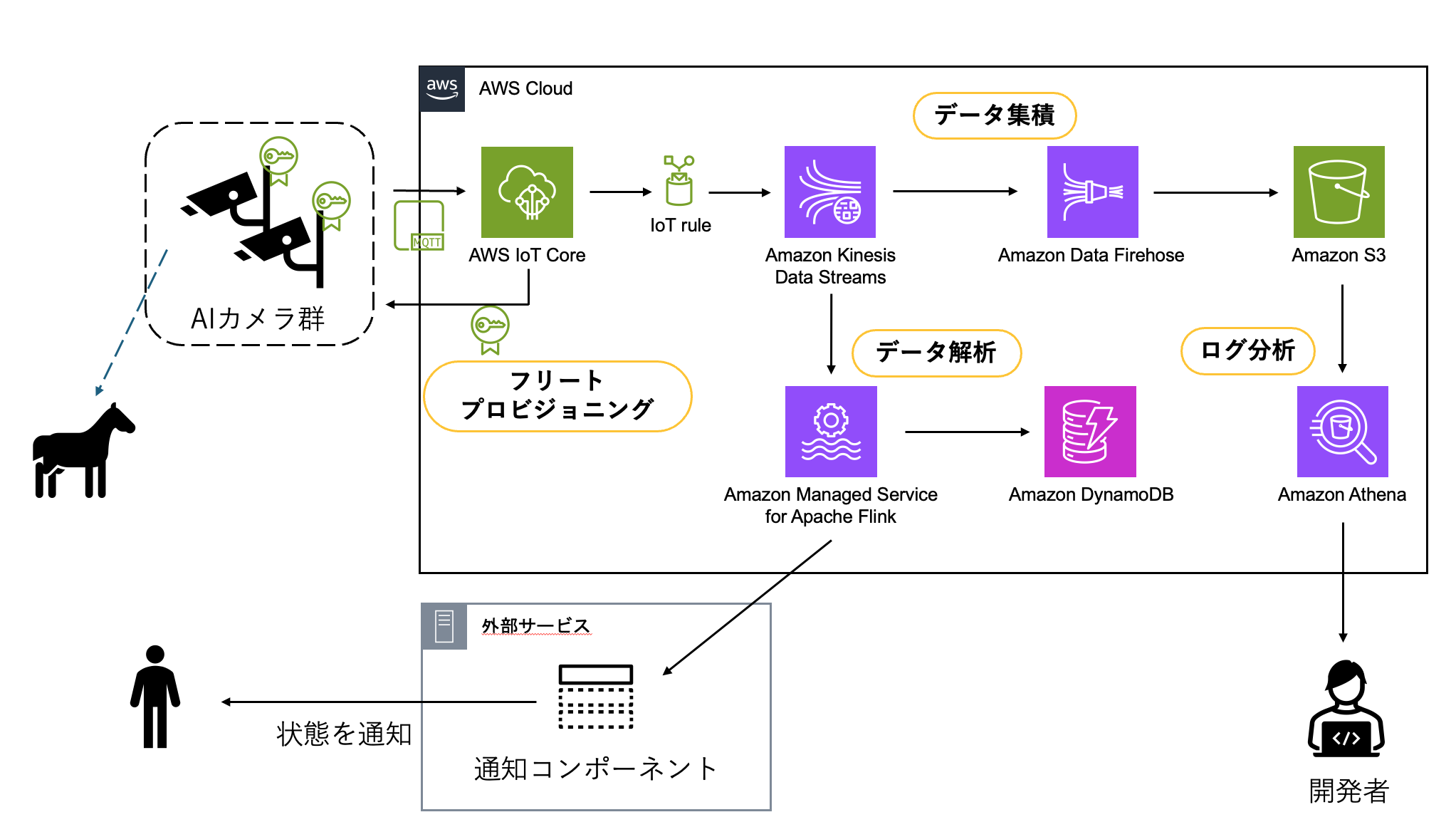 クラウド側では、IoT Core から受信したデータを Amazon Kinesis Data Streams に連携し、Amazon Managed Service for Apache Flink でリアルタイム解析を行います。異常を検知した場合は、エンドユーザーのスマートフォンに即座に通知が送信されます。通知には異常検知時とその前後の映像へのアクセス情報が含まれており、離れた場所からでも馬の状態を確認できます。