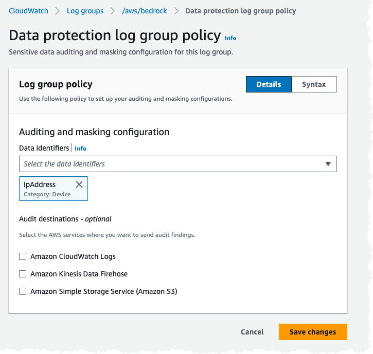 CloudWatch ログ設定セクションで、ロググループ名を指定します (この場合は /aws/bedrock を選択しました)。最初にこのロググループを CloudWatch で作成する必要があることに注意してください。