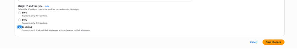 [Additional settings] を展開し、Origin IP address type で [IPv6] または [Dualstack] オプションを選択して、オリジンへの IPv6 接続を有効にします。オリジンを作成したら、新しいオリジンを指すようにビヘイビアを追加または更新します。