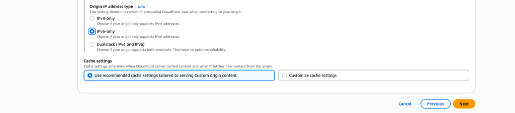 オリジン IP アドレスタイプ設定に IPv6 または Dualstack を選択し、[Next] を選択します。