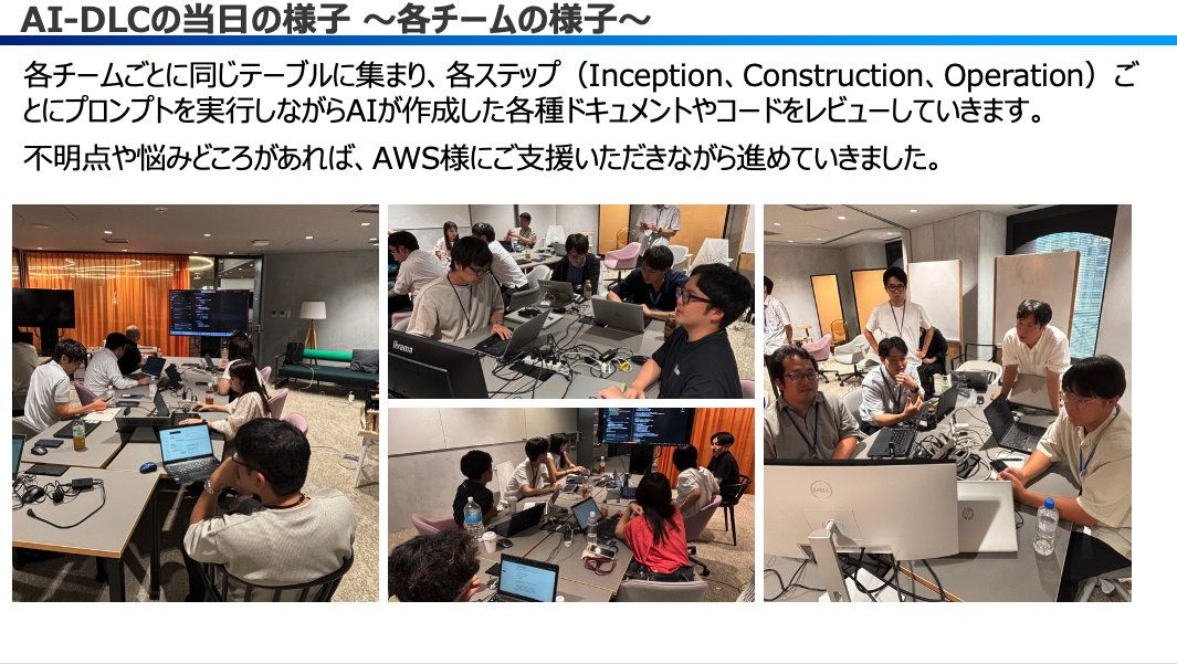 AI-DLC Unicorn Gym 実施内容の詳細はブログ「東京海上日動システムズ株式会社様の AWS 生成 AI 事例:金融業界初 AI-DLC Unicorn Gym による開発変革への挑戦」も併せてご覧ください。