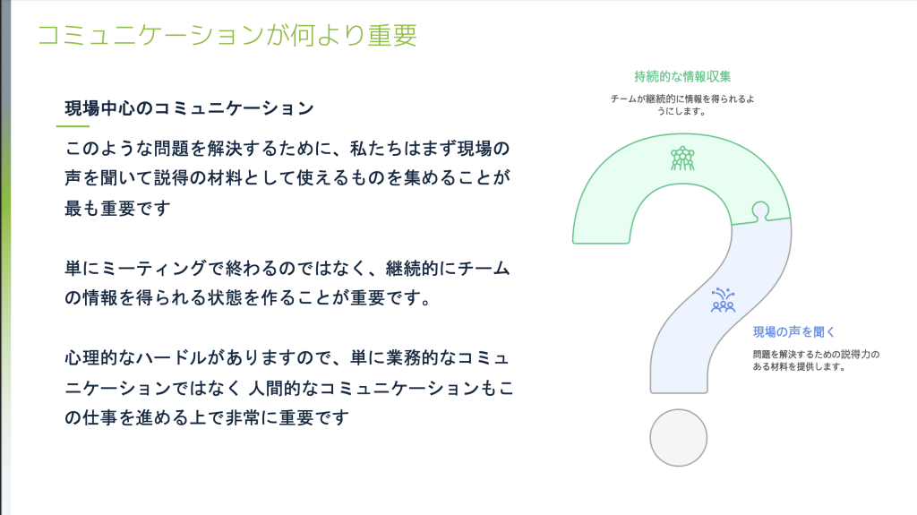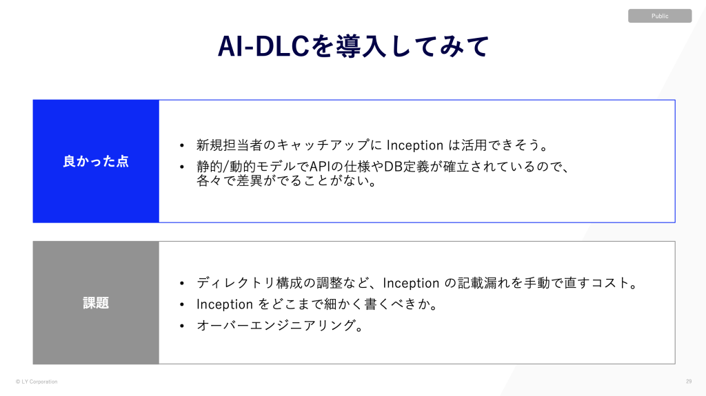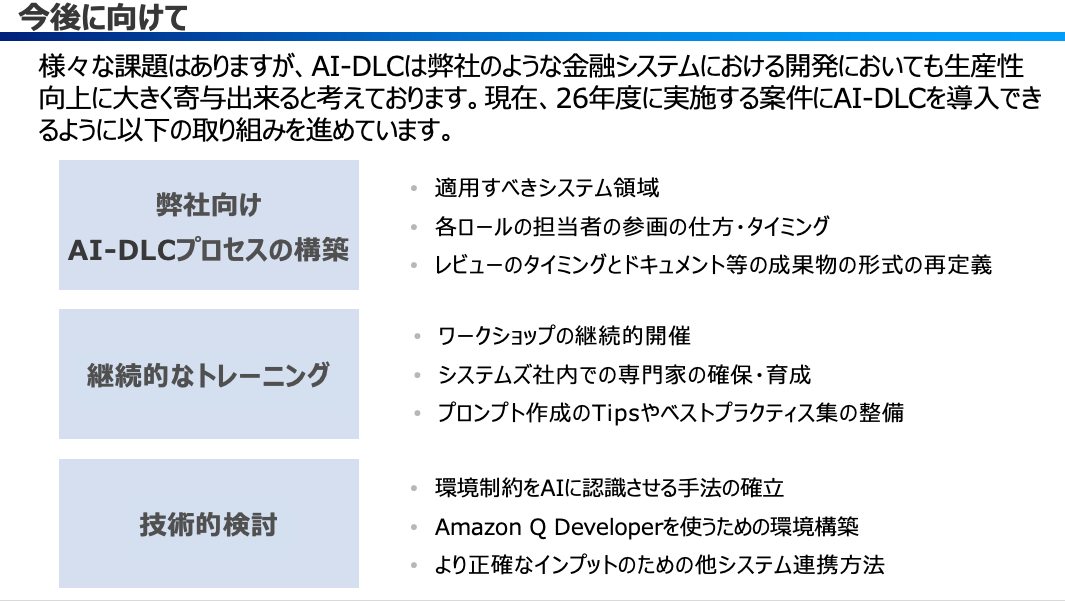 一次情報は社員が普段から利用しているツールから MCP Server 経由で取得していることや、AI-DLC のアウトプットを新規担当者のキャッチアップ資料などに活用していること、AI-DLC を軽量にカスタマイズして取り入れていることをご紹介いただきました。AI エージェントとの対話内容の例や実際のアウトプットについてもご共有いただきました。これからの展望として、アウトプットであるドキュメントの更新・メンテナンスの仕組みについても検討されていることをご紹介いただきました。