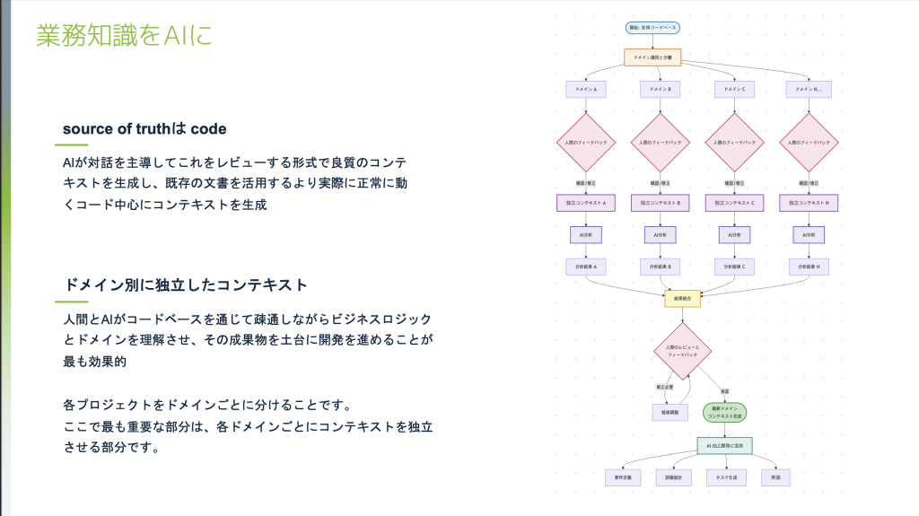 株式会社サイバーエージェント様からは「CA 流、現場と伴走する AI 駆動開発」と題して、AI 駆動開発の全社展開を目指す背景とその実践についてお話しいただきました。AI 駆動開発の浸透・普及により AI 活用を強化し、競争力のあるプロダクトを作ることの重要性や、AI を前提とした開発文化の定着には全社への浸透、行動様式や意思決定プロセスの変革も必要である、と言う方針についてご紹介いただきました。既存プロジェクトへの AI-DLC の適用においてはドメイン知識に関するコンテキストの不足や、伝達の難しさについてお話しいただいたのち、Code を Single source of truth とすることや、ドメインごとに独立したコンテキストを与えるという AI へのドメイン知識の伝達方法をご説明いただきました。最後に、AI 活用の普及には継続的に開発チームとコミュニケーションし、二人三脚で進めていくことが重要であるとも述べていただきました。