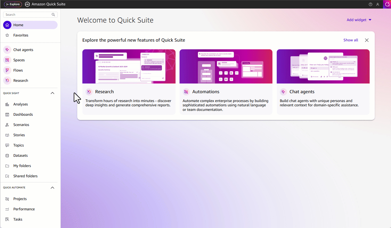 - Quick Suite コンソールで、ナビゲーションペインの Explore を選択し、Chat agents を選択します。