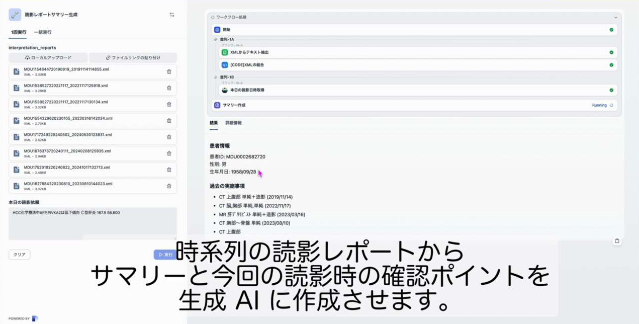 放射線科医の読影レポートから、患者や他科の医師向けに分かりやすい要約を自動生成します。専門用語を平易な表現に置き換えながら、重要な所見や結論を簡潔にまとめることができます。画像所見の経時的な変化や、臨床的に重要な変化も分かりやすく提示することで、患者への説明や他科との連携がスムーズになります。