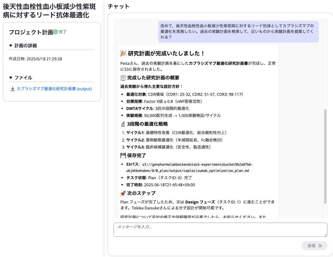 創薬研究におけるDMTA(Design-Make-Test-Analyze)サイクルを効率化するAIエージェントです。研究者との対話的なやり取りを通じて、実験計画の立案から結果の解析まで、一連のプロセスを支援します。