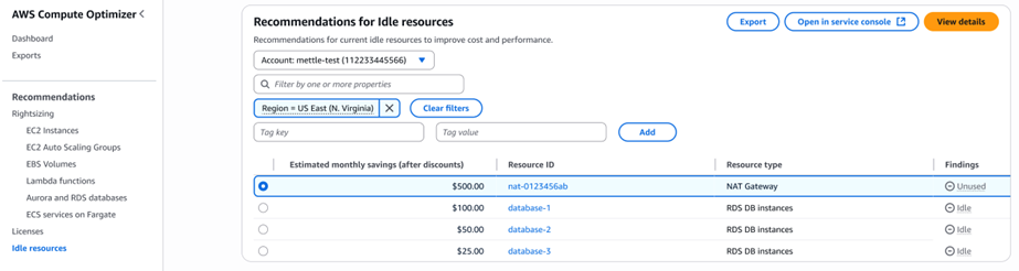 Compute Optimizer にオプトインすると、24 時間以内に使用されていない NAT ゲートウェイのレコメンデーションが自動的に提供され始めます。これらのレコメンデーションは、Compute Optimizer コンソールの既存のアイドル状態のリソースの検出結果と並んで表示されます。