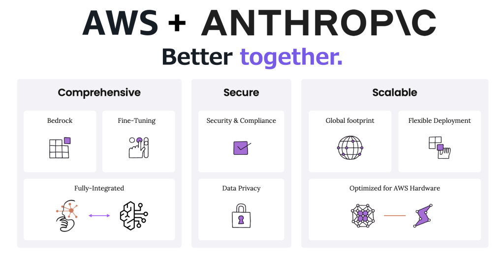 Amazon Bedrock は、生成 AI アプリケーションやエージェントの構築に適した包括的でセキュアかつ柔軟なプラットフォームです。Amazon Bedrock の一機能として、Anthropic の Claude を含む基盤モデルをセキュアで簡単に利用できる API を提供しており、国内でも多数の本番利用における公開事例があります。