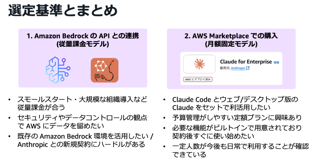 昨今は、特に Claude Code に関するお問い合わせが増えているため、Claude Code に絞って AWS と組み合わせて利用できる方法を整理すると、上記で説明した Amazon Bedrock と Claude for Enterprise に対応する形で二種類の方法があります。一つ目は Claude Code と Amazon Bedrock API 経由の Claude モデルを組み合わせる方法であり、従量課金でデータをAWSに留めて利用できる方法になります。もう一方は AWS Marketplace 上で Claude for Enterprise の Premium seat を購入する方法であり、これは予測可能な予算管理が好ましい場合や、ウェブ・デスクトップ版の Claude も合わせて活用したい場合、必要な機能をビルトインですぐ使い始めたい場合に適しています。