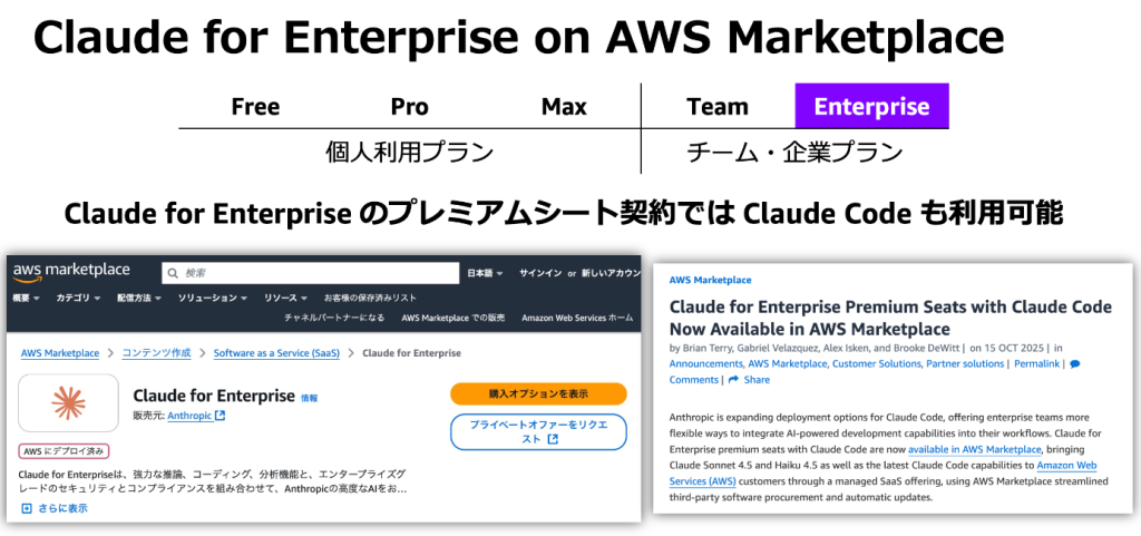 AWS Marketplace は、サードパーティのソフトウェア、データ、サービスを売り買いできる厳選されたデジタルカタログであり、購入者としてはソフトウェア調達やライセンス管理を簡素化することができます。例えば、サードパーティが提供する SaaS を AWS Marketplace からサブスクライブし、AWS インフラの支払いと SaaS 製品の支払いを集約できる機能も提供しています。現在では、Anthropic の Enterprise プランである “Claude for Enterprise“ を AWS Marketplace 上で購入することができるようになっており、Claude のウェブやデスクトップ版が利用できる Standard seat だけでなく、Claude Code を合わせて利用できる Premium seat も取り扱っています。