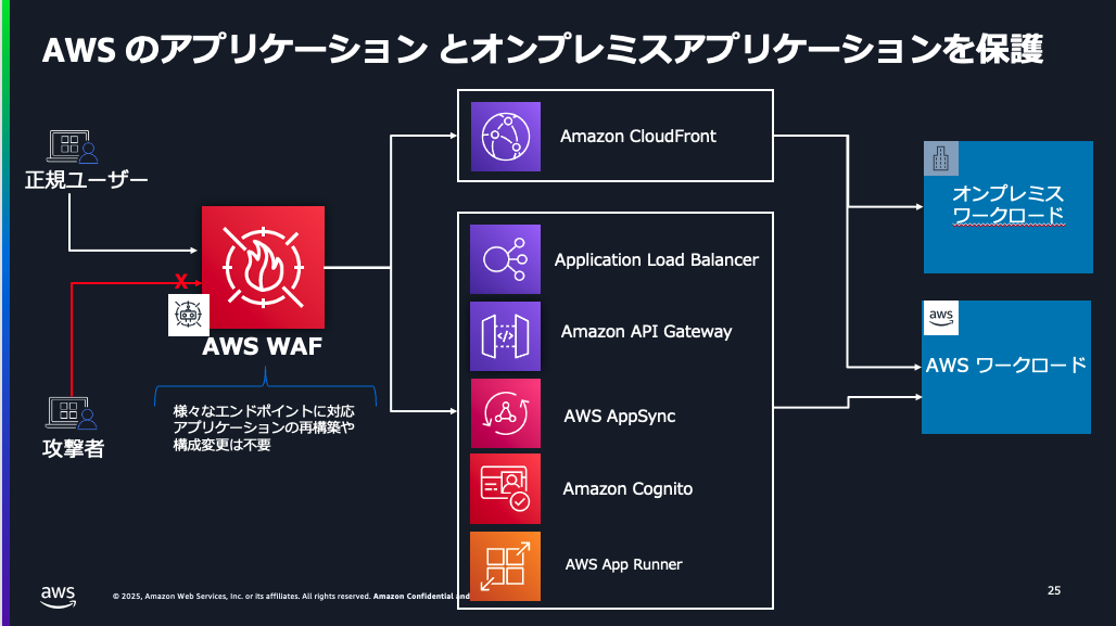 - AWS WAF は、Web アプリケーションに送信される HTTP/HTTPS リクエストを監視し、コンテンツへのアクセスを制御するWebアプリケーションファイアウォールです。Amazon CloudFront、Application Load Balancer、Amazon API Gateway、AWS AppSync、Amazon Cognito、AWS App Runner、などのリソースを保護できます。WebACL または保護パックでルールを定義し、IP アドレス、地理的位置、リクエストヘッダー、SQL インジェクション、クロスサイトスクリプティングなどの条件に基づいて、リクエストの許可・ブロック・カウント・CAPTCHA 実行を制御します。