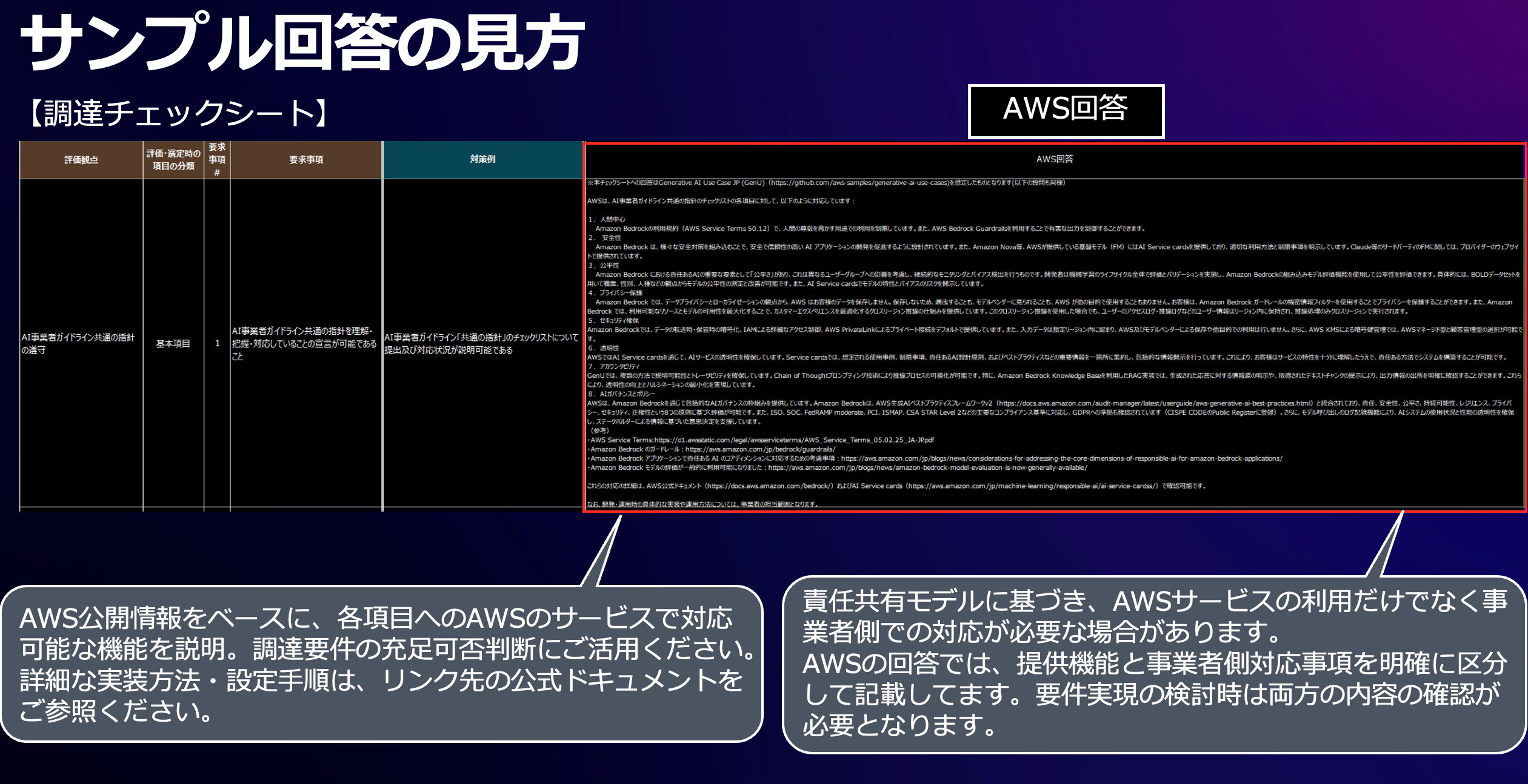 政府ガイドラインでは、政府機関の生成AIシステムの調達時に「調達チェックシート」の活用が求められています。 AWS では、このチェックシートの各項目に対して、GenUを活用した場合の具体的な対応例をサンプル回答として提供し、政府機関とパートナー企業の皆様を支援いたします。サンプル回答の見方については補足資料をご参照ください。