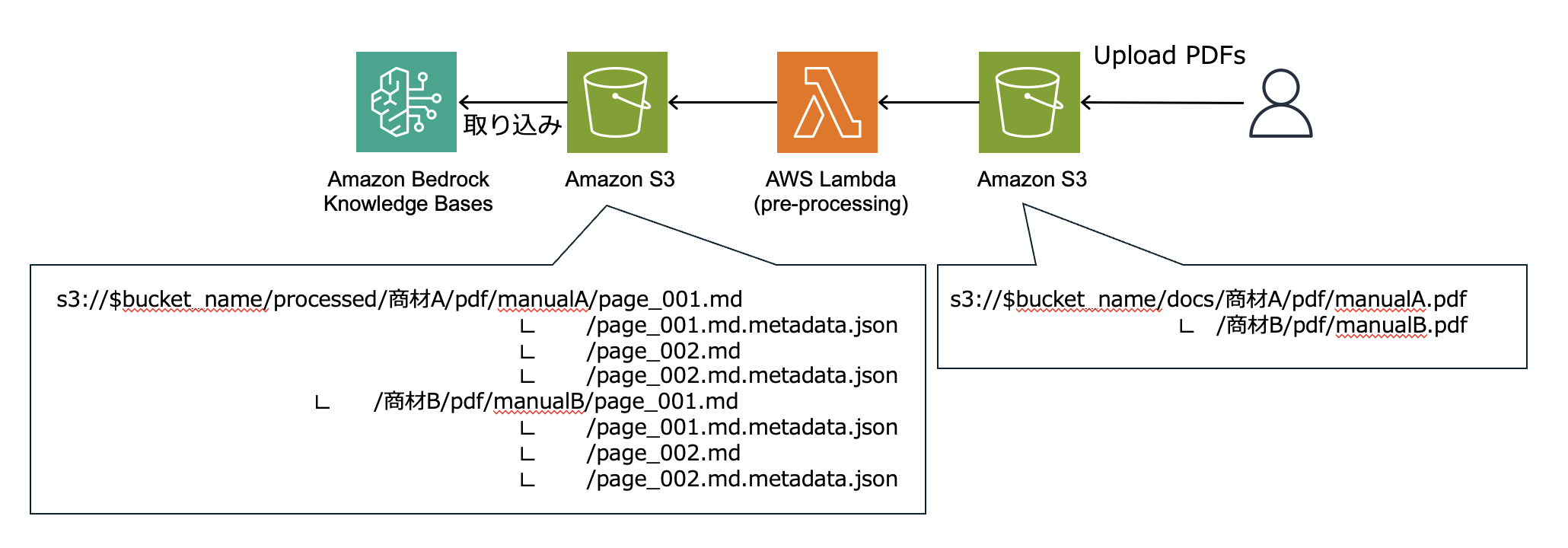 具体的な処理内容としては、運用者が Amazon S3 にアップロードしたマニュアルの pdf ファイルは AWS Lambda (pre-processing) を通じて、(A) ページ分割した上で、Markdown 形式に変換、(B) マニュアルに付与するメタデータを作成、の 2 つの処理が行われた後、Amazon S3 に格納されます。(A) の処理では、ページ分割することで RAG 回答で参照したマニュアルのページ番号をファイル名から特定できるようにしています。また、マニュアルに含まれる表データの抽出精度向上のため、pdf 文書をテキスト化するための python ライブラリである pdfminer を用いて HTML 化し、その後 Claude 3.5 Sonnet で Markdown 形式に変換しています。なお、Claude 3.5 Sonnet はマルチモーダル対応 LLM であるため、画像認識による情報抽出も可能ですが、検証時点では pdfminer を介す方法の方が優れていると判断しました。(B) の処理では、S3 のオブジェクトキー情報からカテゴリ情報等を抽出して、.metadata.json