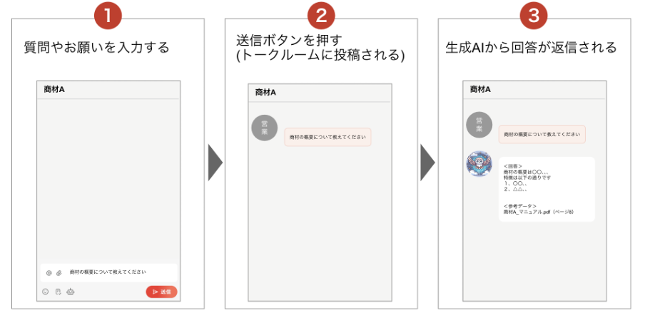営業支援 AI ボットは elgana 上に構築しました。トークルーム上で営業支援 AI ボットに対して商材に関する質問を入力すると、AI ボットが即時に回答を提示する仕組みです。また、AI ボットからの回答には、補足情報として関連するマニュアルページへのリンクを設けることで、裏付けとなる情報を容易に確認できる設計としました。
