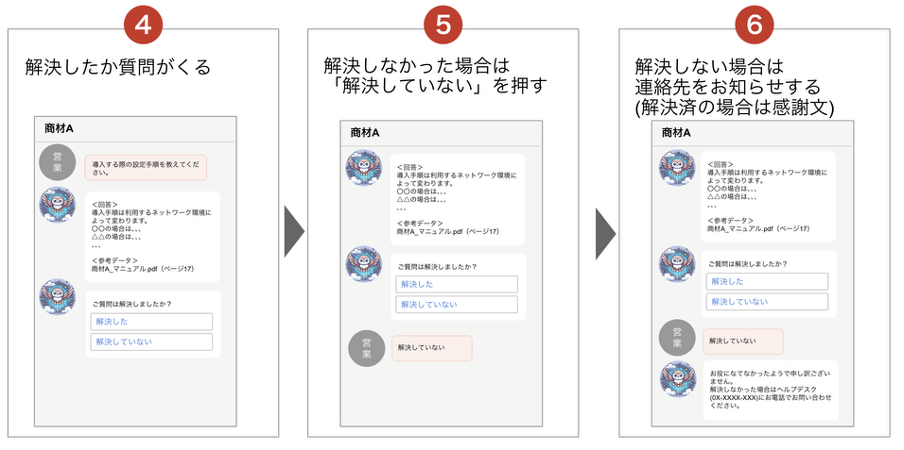 さらに、回答後には「解決した/解決していない」の簡易アンケートを設け、解決率を収集するとともに、未解決のユーザーをヘルプデスクに誘導する流れを設けています。これにより、AI の強みと有人対応を組み合わせた実用的なサポート体験を実現しています。