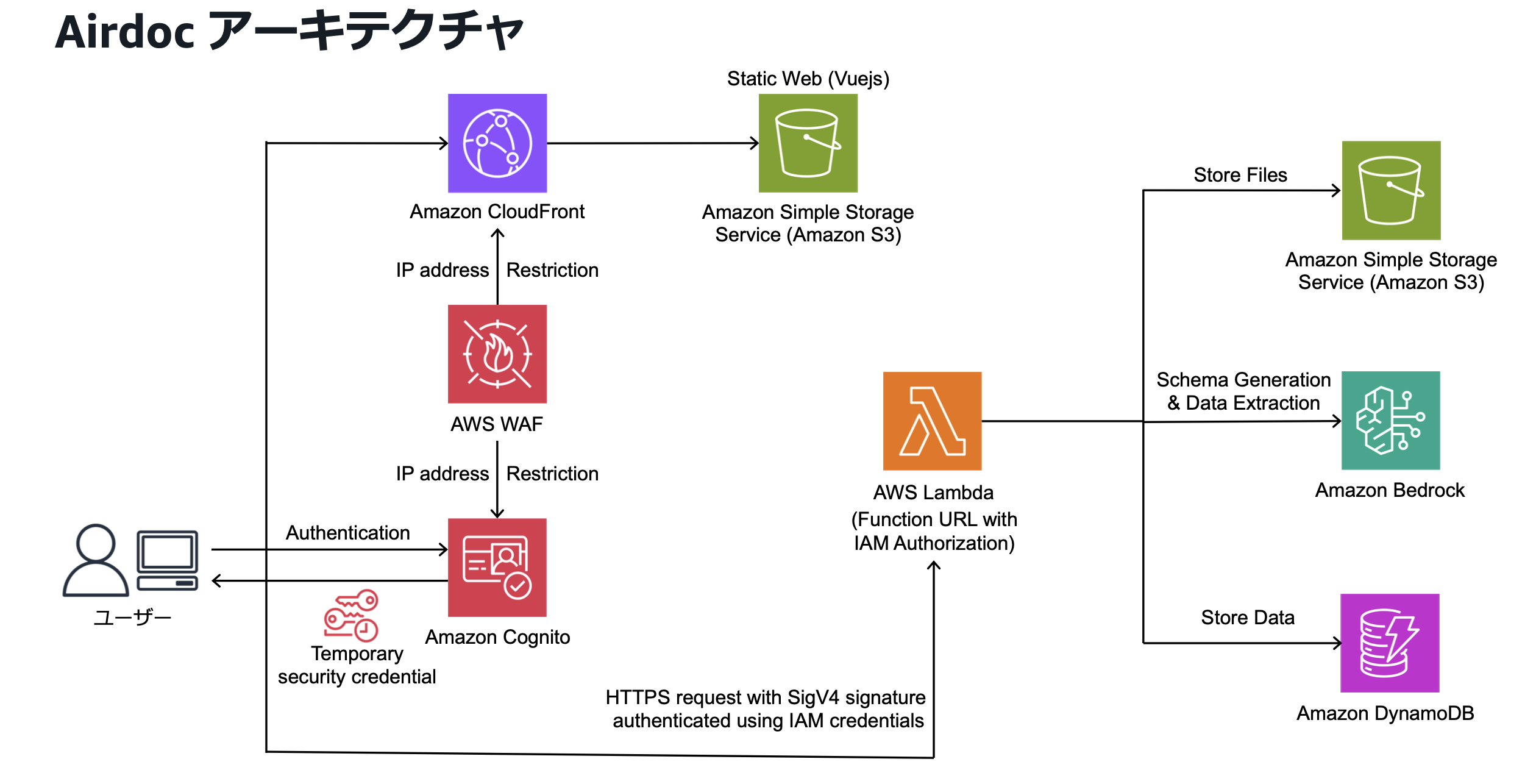 - セキュリティの観点では、AWS WAF で IP アドレス制限をかけたり、Amazon Cognitoで認証認可を行っています。また、フロントエンドのアプリケーションから AWS Lambda の Function URL に API リクエストを送る部分では、SigV4 署名で IAM の認証情報を追加しています。