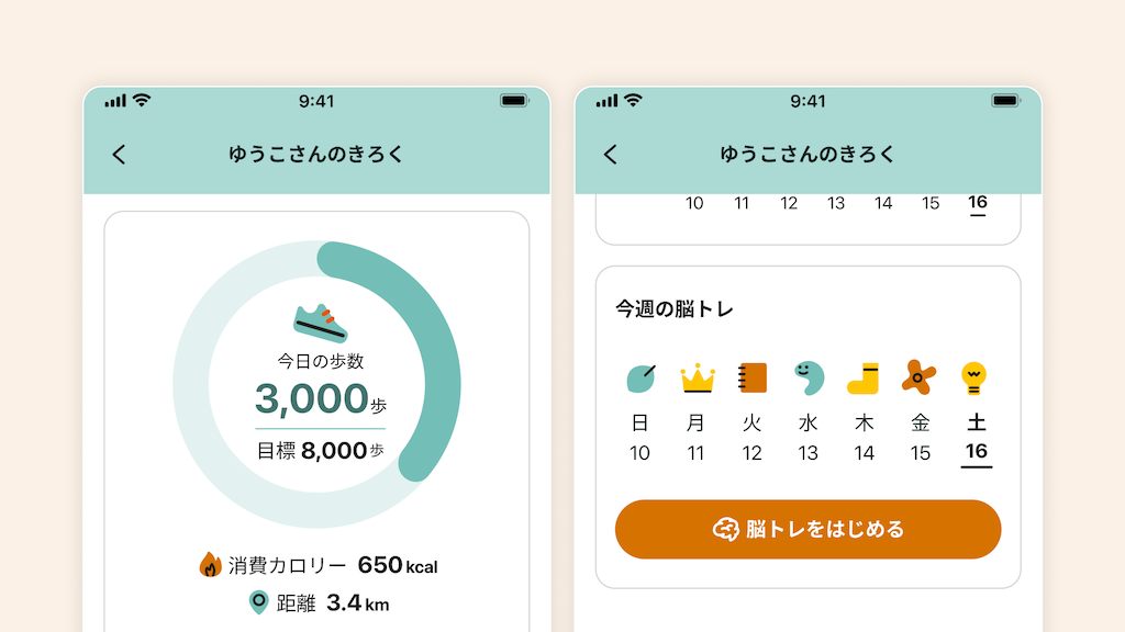 脳トレゲームとしてブレインワークアウトを搭載。計算問題や記憶ゲームなど、スキマ時間に手軽に楽しく取り組める全10種類のゲームです。脳の活性化を促し、認知機能の維持をサポートします。その他にも脳の健康情報サイトである「脳ラボ」と連携し、脳の健康を意識した食事や睡眠、運動などのコンテンツを提供します。