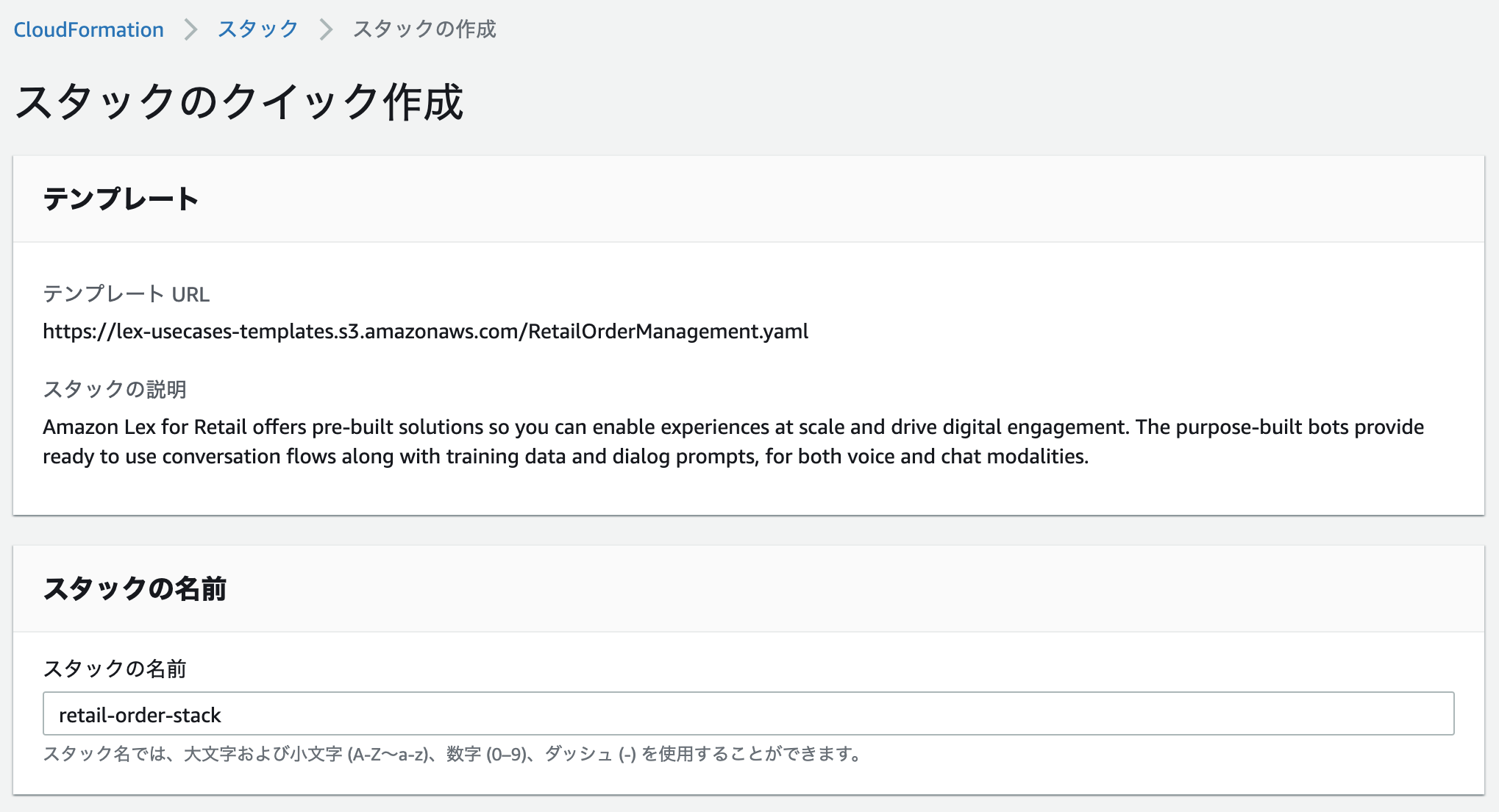 - スタックの名前 に、スタックの名前を入力します。この投稿では、次のスクリーンショットに示すように、retail-order-stack という名前を使用します。