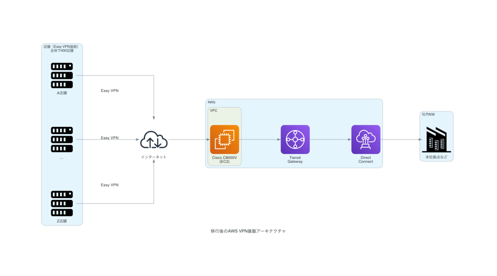 本記事は、「ファッション」「生活雑貨」「飲食」を中心とした小売業を営むサザビーリーグが全国600店舗の VPN 基盤を AWS へ移行した事例です。Cisco ASA5545 のサポート終了に伴い、AWS上に Catalyst 8000V を構築し、Transit Gateway と AWS Direct Connect を組み合わせた構成で、店舗への影響を最小限に抑えながら移行を実現しました。
