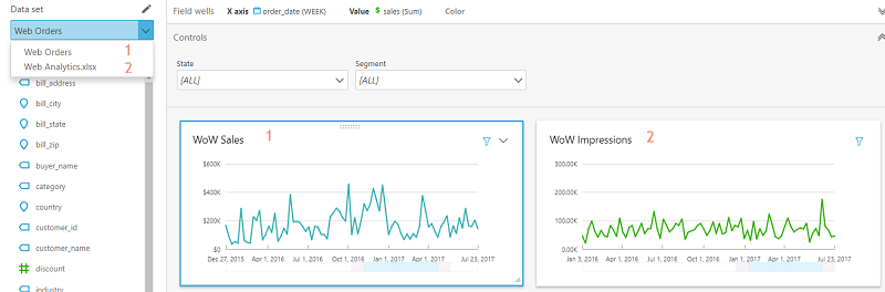 次のようなダッシュボードがあるとします。ここではWeb Orders と Web Analytics という、2 つのデータセットを使っています。この 2 つは、たとえば Amazon Redshift のような同一のデータソースから取ってきたものでも、それぞれ全く別のデータソース(Amazon Redshift と Microsoft Exel、または Amazon Athena などなど)から取ってきたものでも構いません。